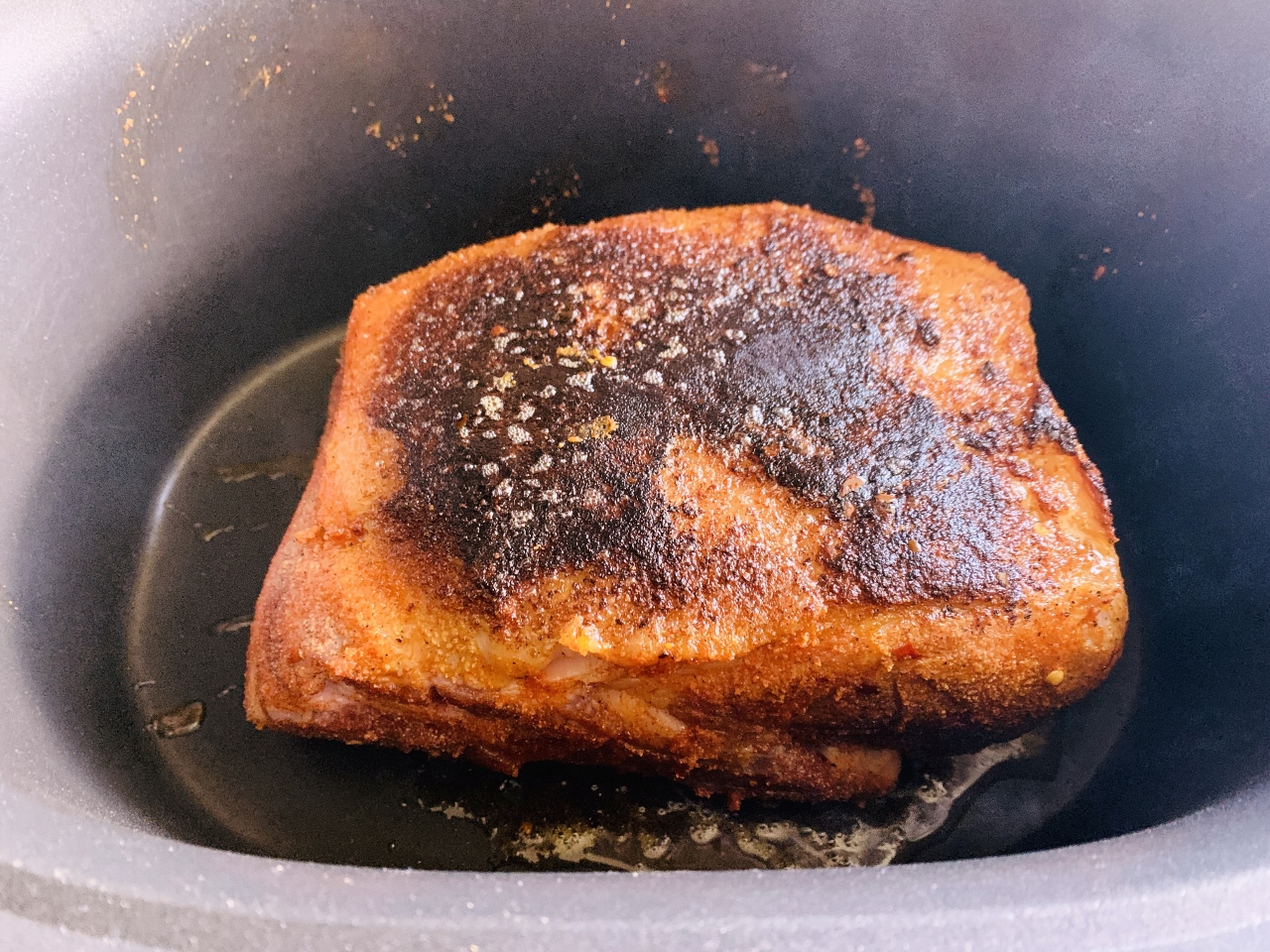 - Remove pork from refrigerator at least 30 minutes before cooking. In a slow cooker insert or large pot, add oil and place over medium-high heat. After 2 minutes, add pork and sear on all sides until deep golden brown, about 8 minutes.