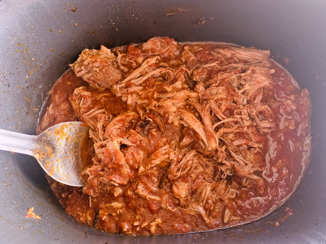 - Remove pork from slow-cooker with spatula. Remove any fat layer and bone. Using a large spoon, skim off excess oil from top of sauce. Shred pork with two forks, leaving it in large shredded chunks. Add shredded pork back to the sauce and stir to combine flavors.