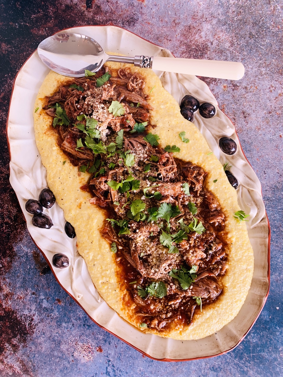 - Spoon polenta onto a serving platter and ladle pork sugo over top. Sprinkle with fresh herbs and serve hot. Enjoy!