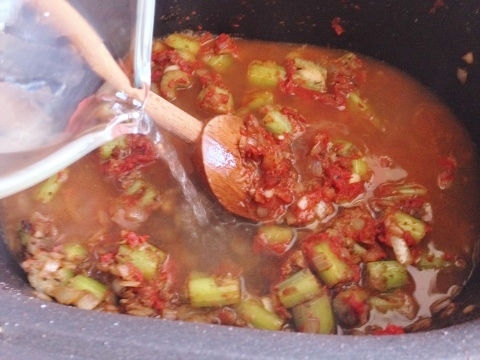 5.  Stir in tomato paste and continue to cook for 2 minutes. Add beef broth and 1 cup of water to pot and stir, continuing cooking for 3 minutes.