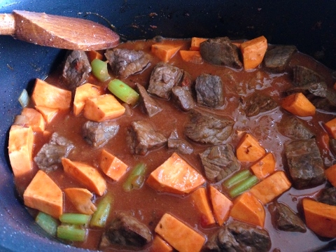 6.  Add sweet potatoes and seared stew meat to pot and stir to combine.  Place insert into slow-cooker. *If you are using a regular stove top pot, pour ingredients into your slow cooker.
