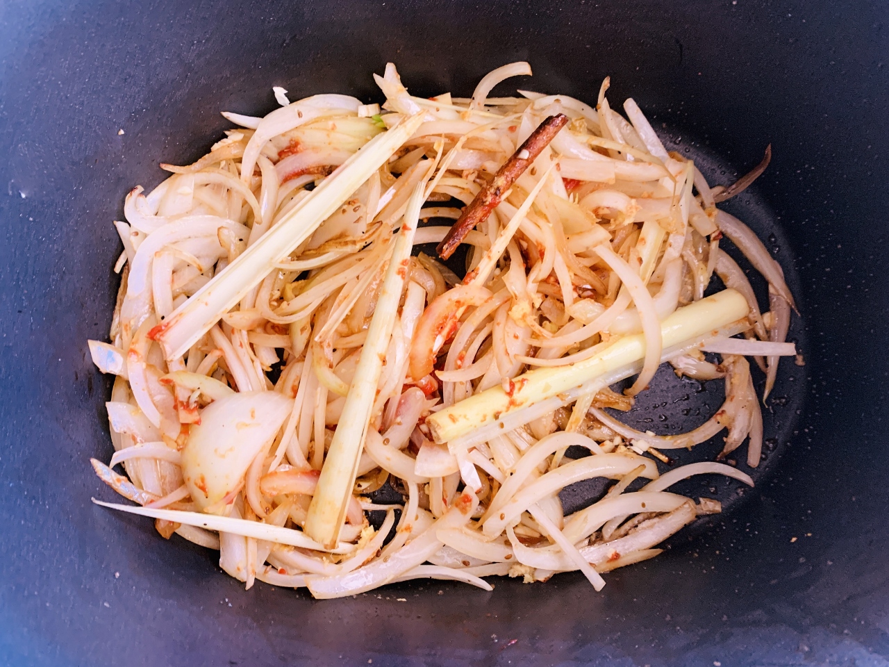 - In same pot, add onions, garlic, and ginger over medium heat. Cook for 2 minutes, add tomato paste, chili paste, lemongrass stalk, anise seed and cinnamon stick, stir. Cook for 1 minute.