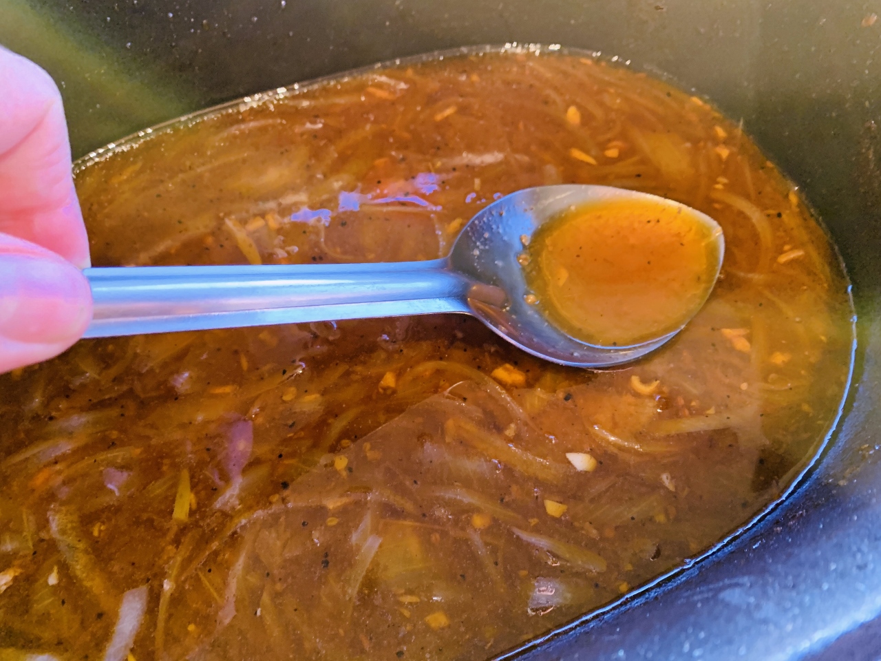- When roast is done, remove from pot. Skim fat off top of broth, and place over medium heat on stove top to reduce for 5 minutes. Remove lemongrass stalks and add fish sauce and lime juice, stir.