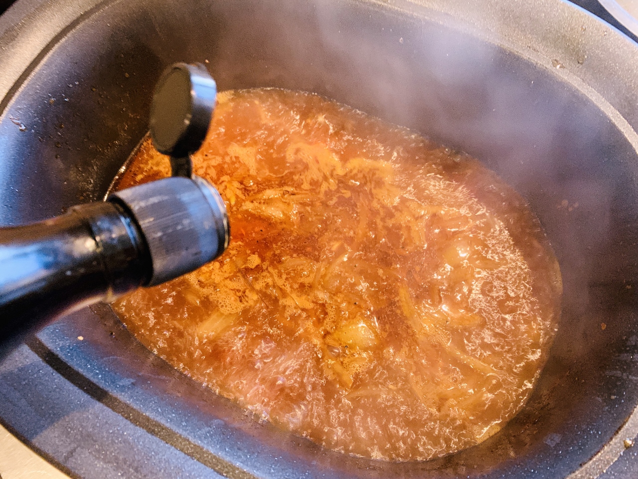 - Add coconut water, and beef broth, stir. Add roast back into pot and add carrots. Place in slow-cooker and set to low for 5 hours.