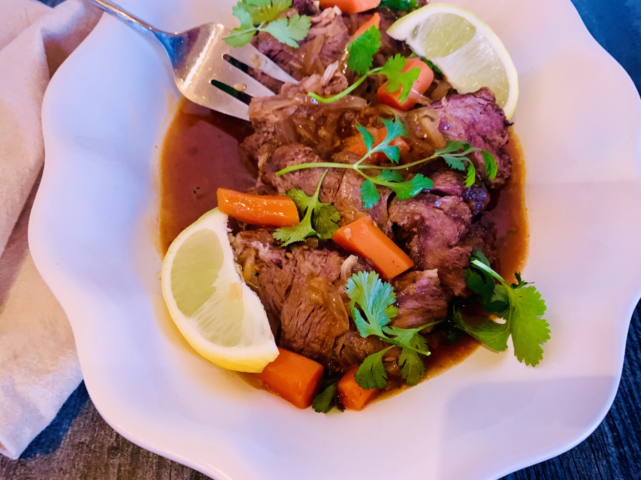 - Slice meat and place on large serving platter or bowl, ladle hot broth over top of meat with carrots. Top with cilantro. Serve with lime wedges. Enjoy!