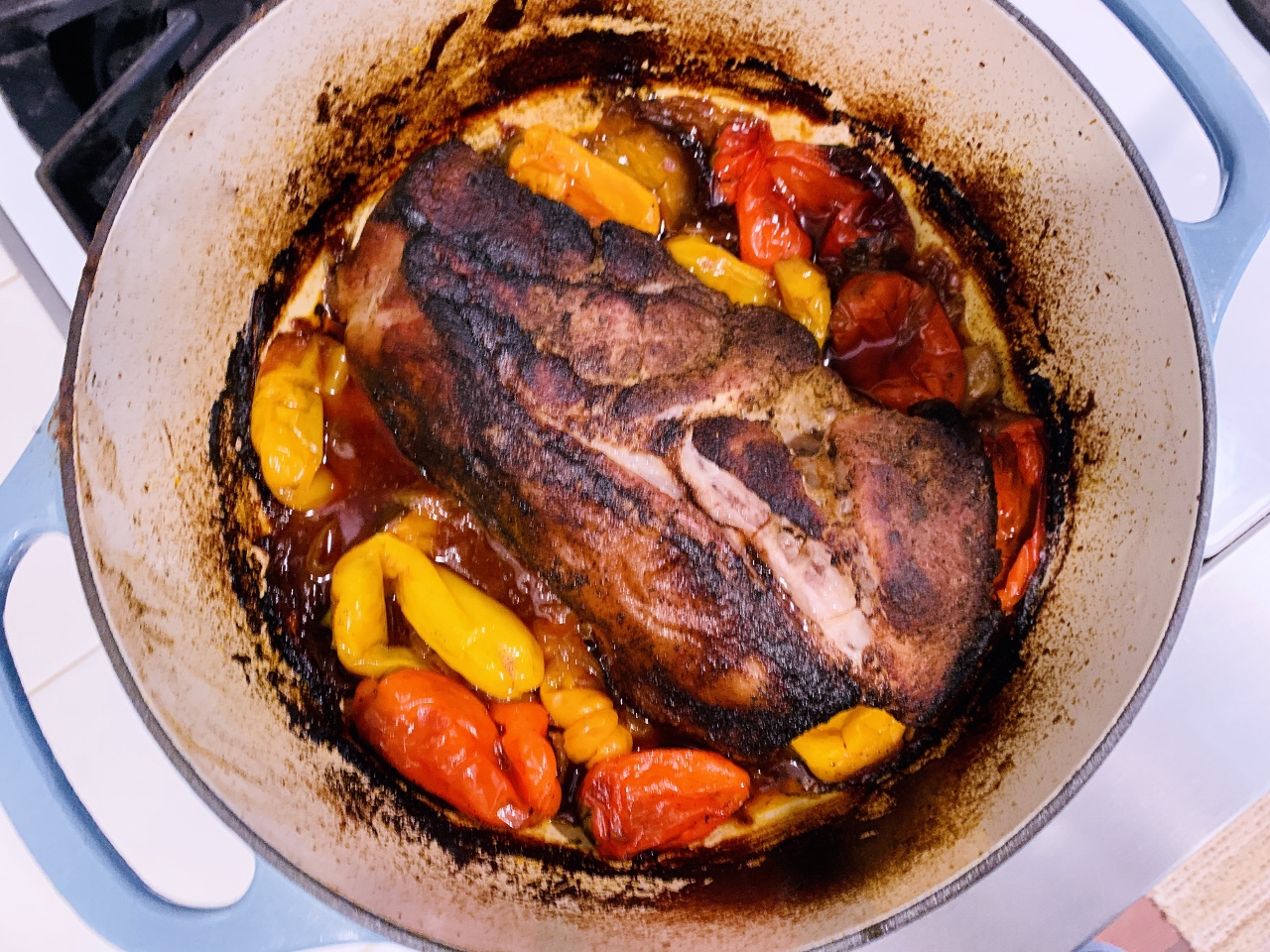 2. In a Dutch oven or large pot with fitted lid, add 1 tablespoon oil and place over medium-high heat.  After 2 minutes, add pork shoulder and sear on all sides, about 10 minutes in total.