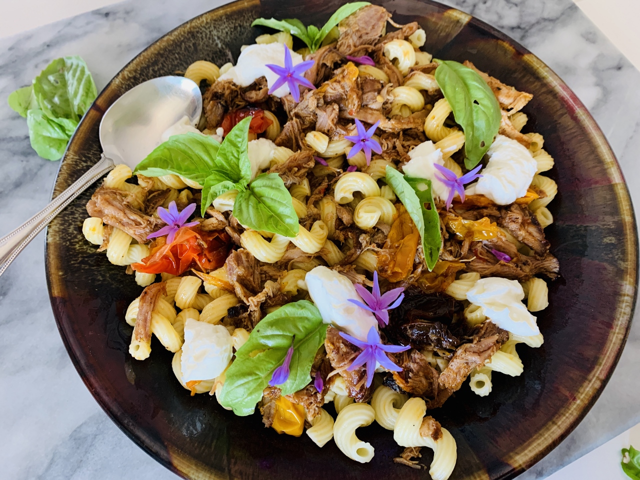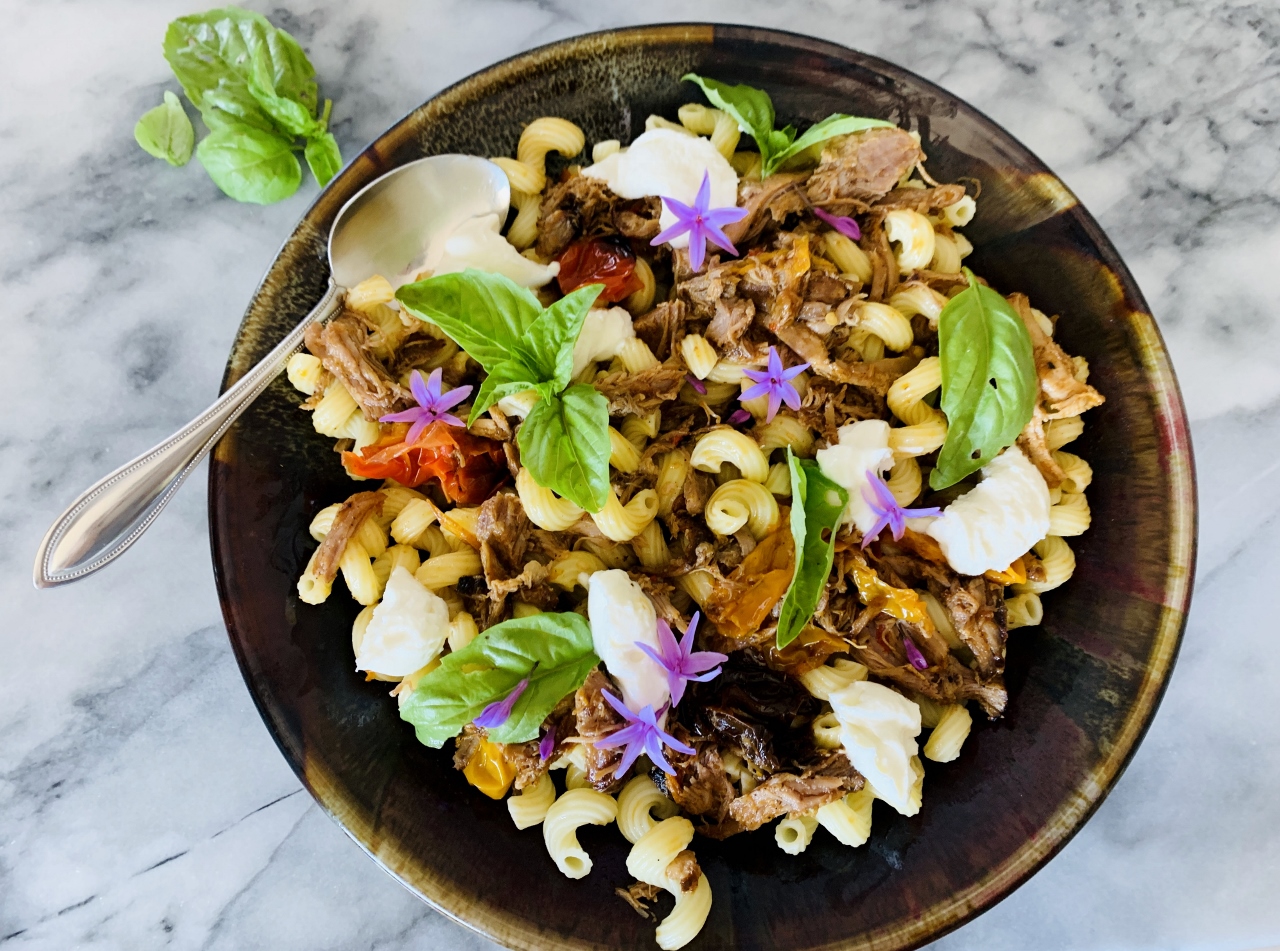 Slow Roasted Pork and Peppers Cavatappi with Ricotta & Basil – Recipe!
