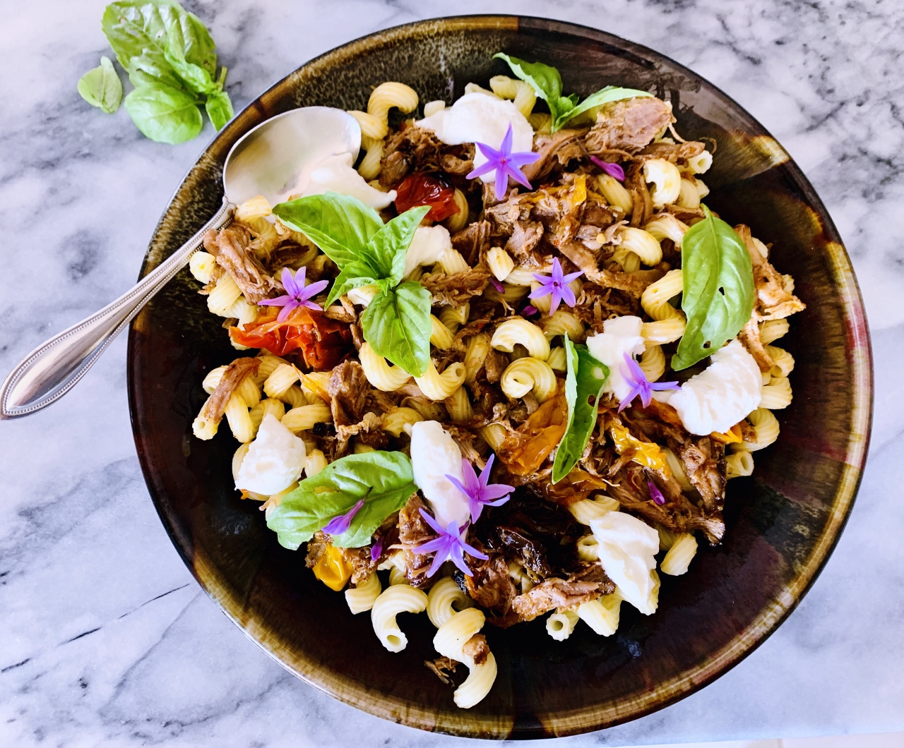 Slow Roasted Pork and Peppers Cavatappi with Ricotta & Basil – Recipe!