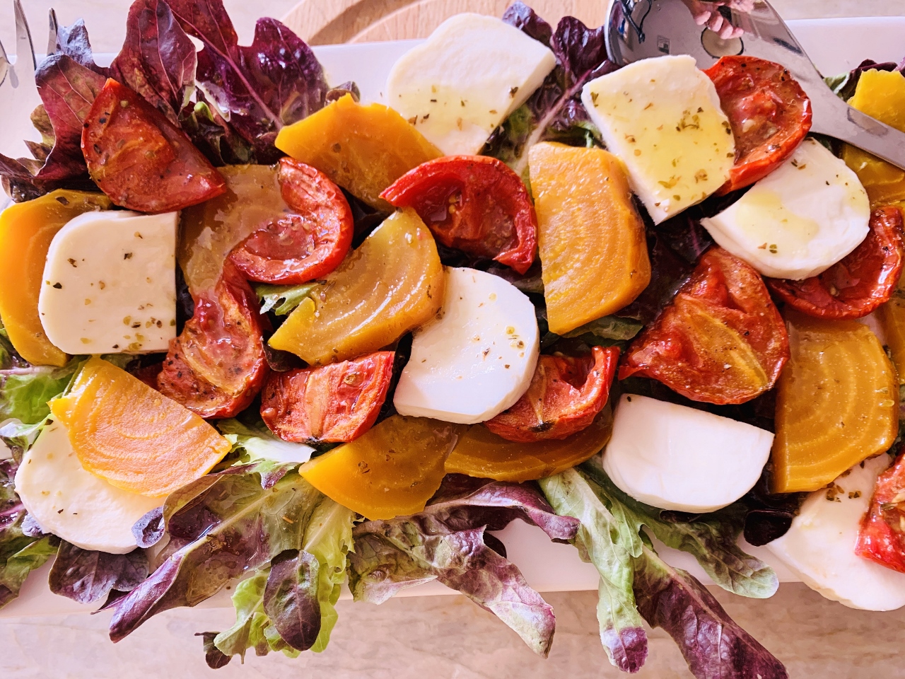 - Place greens on a platter and arrange beets, tomatoes and mozzarella on top. Drizzle with vinaigrette and serve. Enjoy!