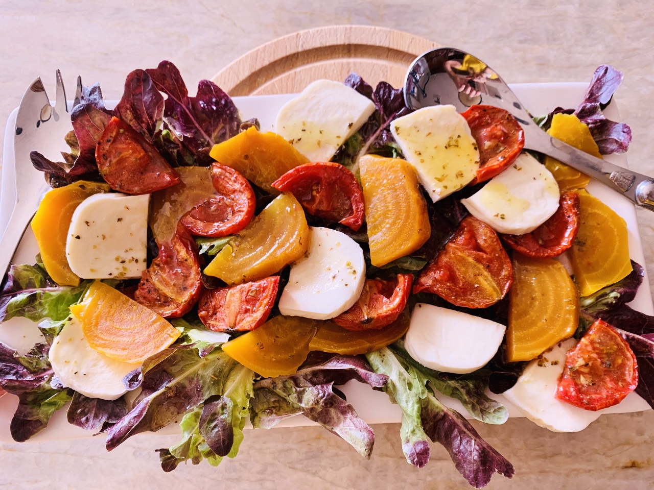 - Place greens on a platter and arrange beets, tomatoes and mozzarella on top. Drizzle with vinaigrette and serve. Enjoy!