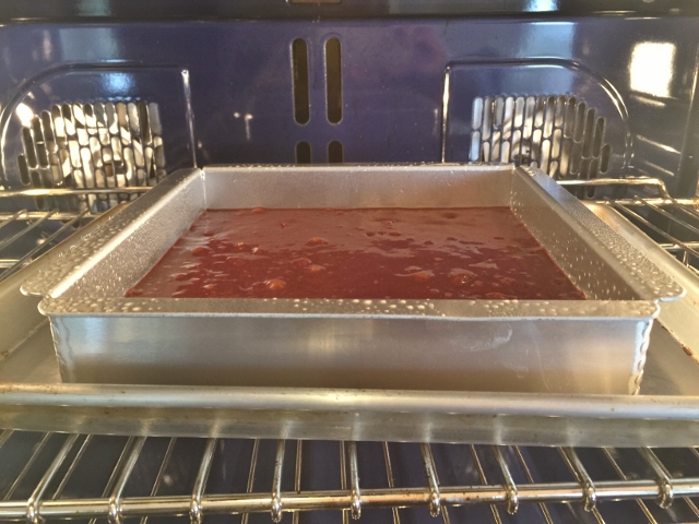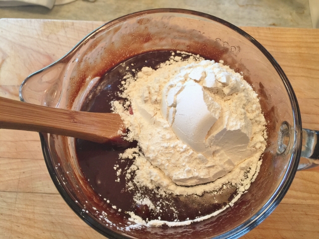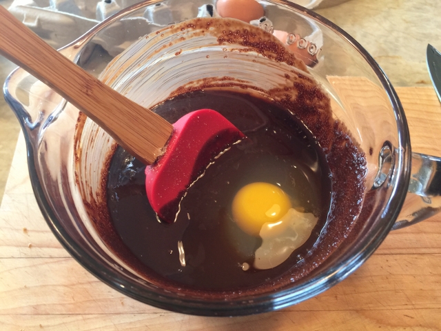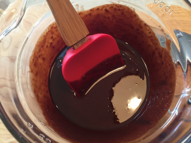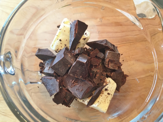 1. Preheat the oven to 350 degrees. Butter or oil a 9 x 9 square pan, removable bottom. If you don’t have a removable bottom pan, line a regular 9 x 9 pan with parchment paper, so the edges hang over, then butter. In a microwave safe bowl, add the unsweetened chocolate and butter. Heat on high for 1 minute. Remove from the microwave and stir. Place the bowl back into the microwave for 30 more seconds and stir again until smooth.