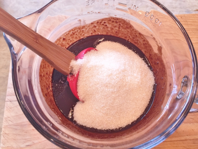 2. Stir in the sugar by hand, until smooth and then pour in the vanilla and stir again. Add the eggs. one at a time until combined.
