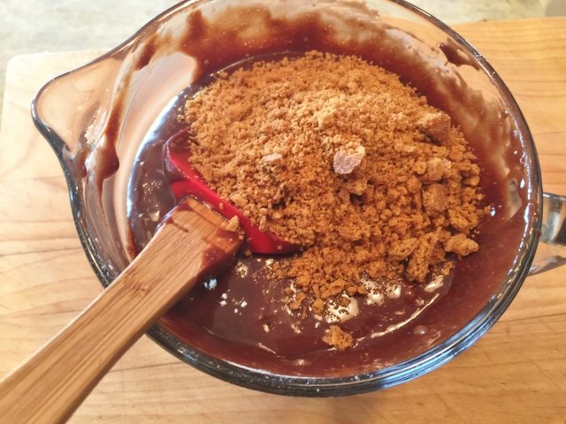 3. Next, add the flour, baking powder and salt and stir until smooth. Crush the graham crackers, until coarse crumbs and add them to the batter, stir to combine.