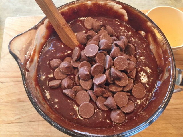 4. Then, add the chocolate chips and stir until smooth. Pour the batter into the prepared pan and bake for 30-40 minutes, or just until firm. Be careful not to over bake.
