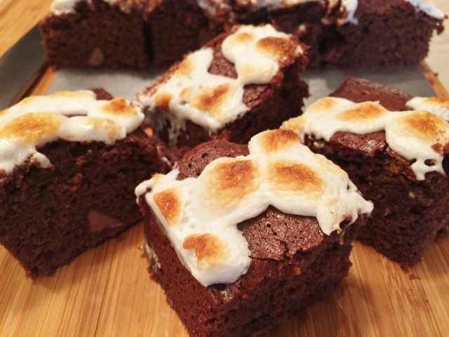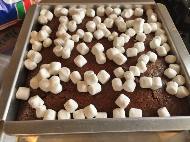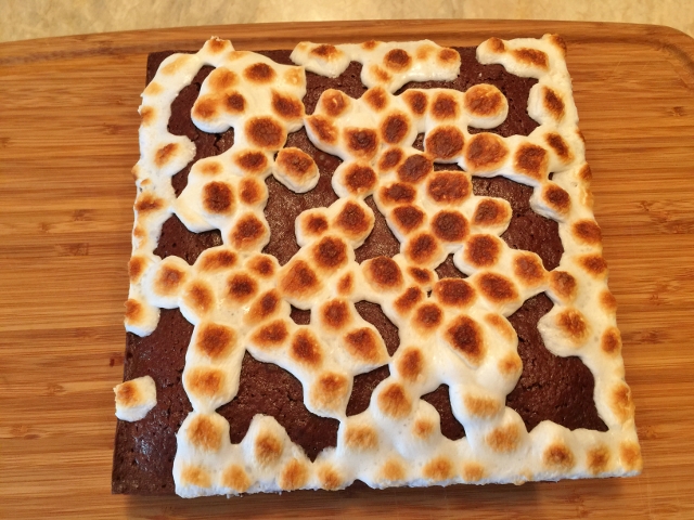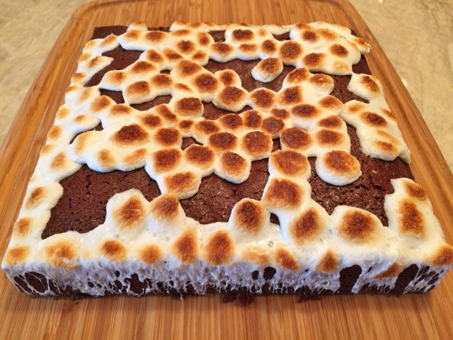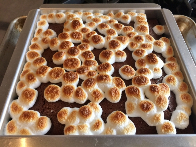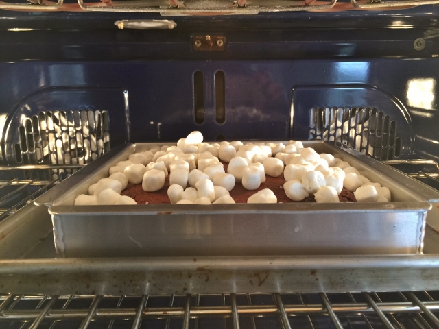 5. Remove the brownies from the oven and turn the oven to broil. Sprinkle the marshmallows over the top of the brownies and place back in the oven for 30 seconds to 1 minute, or just until the marshmallows are golden brown. Keep your eye on the marshmallows, so they don’t burn.
