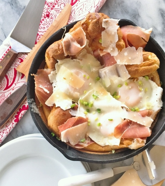 The Savory German Pancake, made with a creamy batter – creates a tender pancake with a delicate crust. The pancake is topped with fried eggs, thinly sliced prosciutto, parmesan cheese and sliced scallions for a savory creation. This airy pancake with all the toppings is crazy good, and soon to be a brunch favorite of your friends and family.