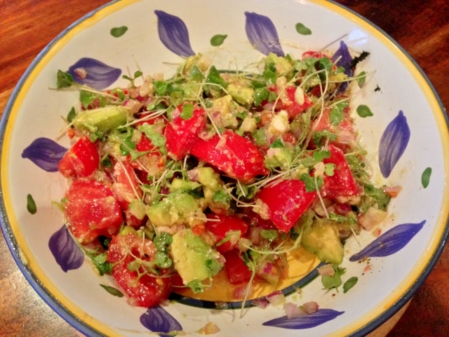 1. Rinse and slice tomatoes into large chunks, and place them in a bowl. Cut the avocado in half and remove the seed, and dice the avocado into large pieces. Scoop out the diced avocado into the bowl with the tomatoes. Dice red onion, and add it to the tomato and avocado mixture.