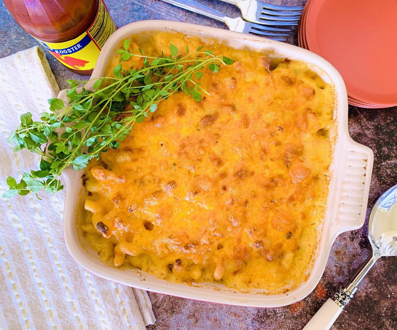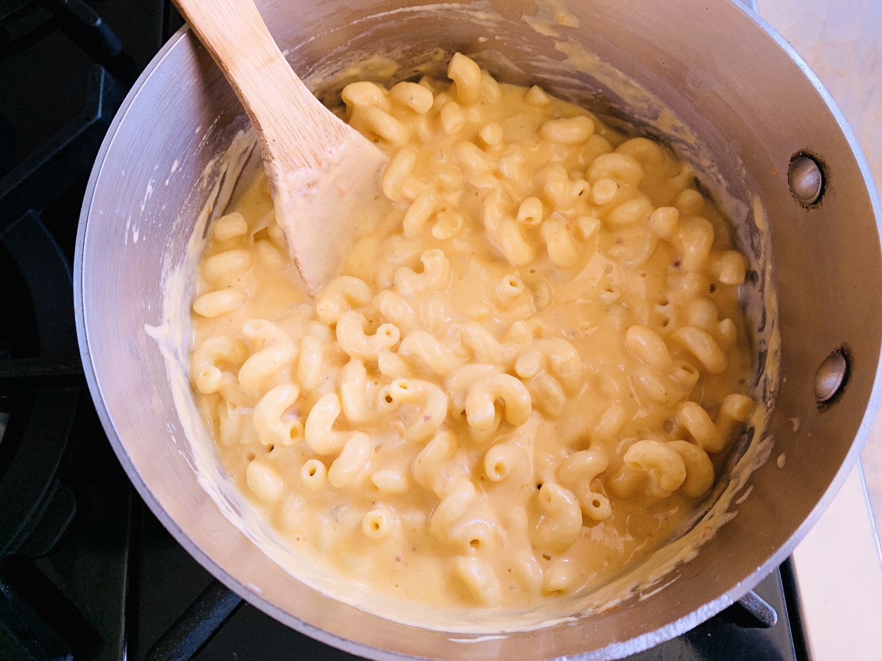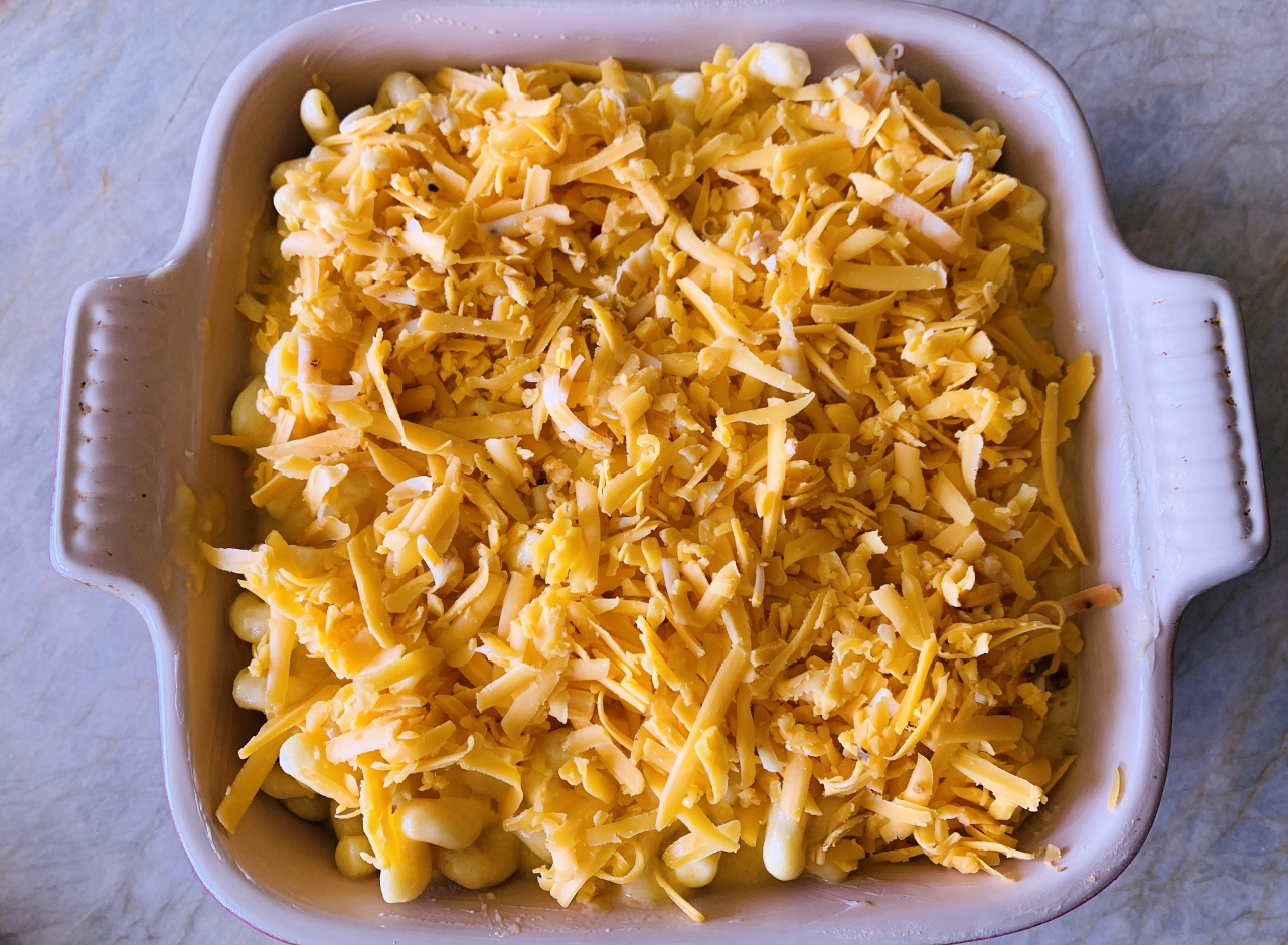 I prefer to make my macaroni and cheese on the stovetop, and then, pour it into a buttered casserole dish and then top it with another layer of cheese, and bake it until bubbling brown. Medium cheddar is always the largest portion of my cheese blend because I like the acidic balance in it better than, sharp or mild cheddar. Then, to make it spicy, but not burning hot, I go with a spicy colby-jack, or straight pepper jack because the bits of peppers create the right amount of heat that’s really worth noticing. You can get as fancy as you want in the cheese category, but I find Boar’s Head and Tillamook do a pretty great job.