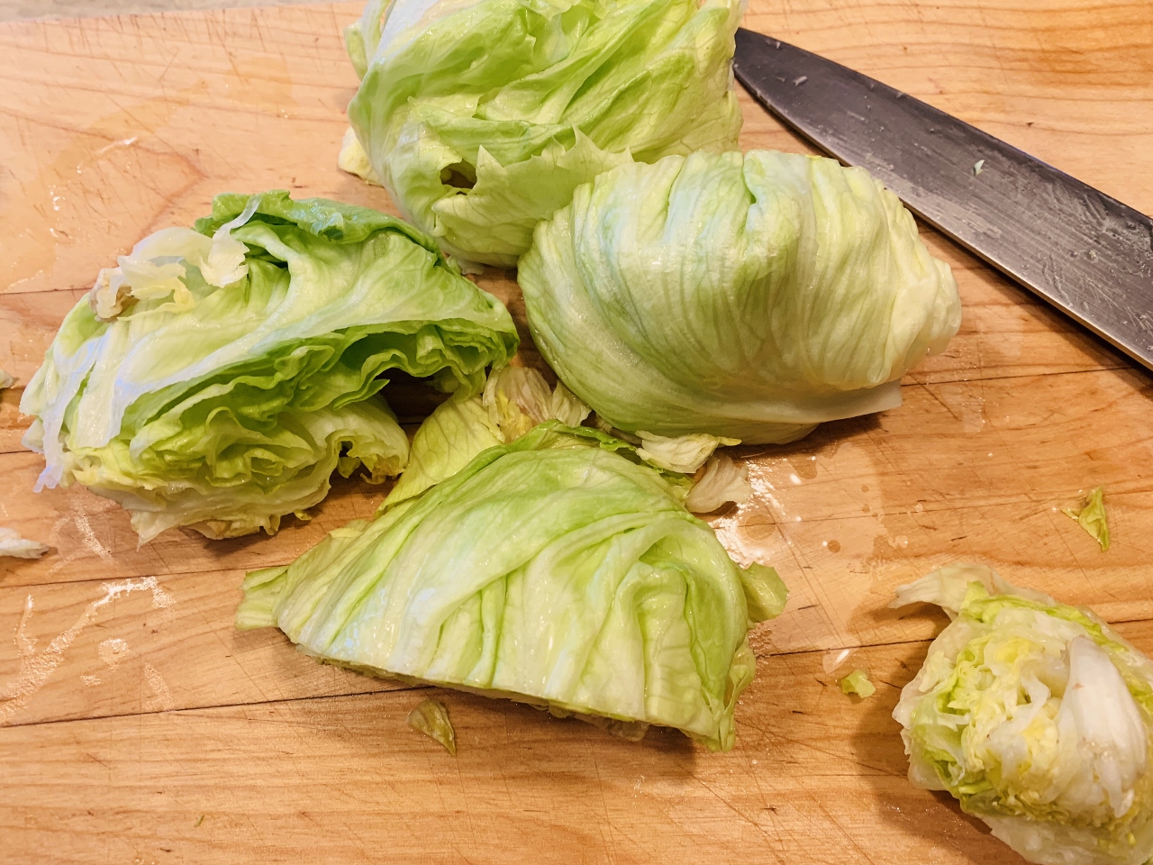 1. Wash and dry head of iceberg.  Remove core from bottom of head and slice lettuce into 4 quarters, set aside.