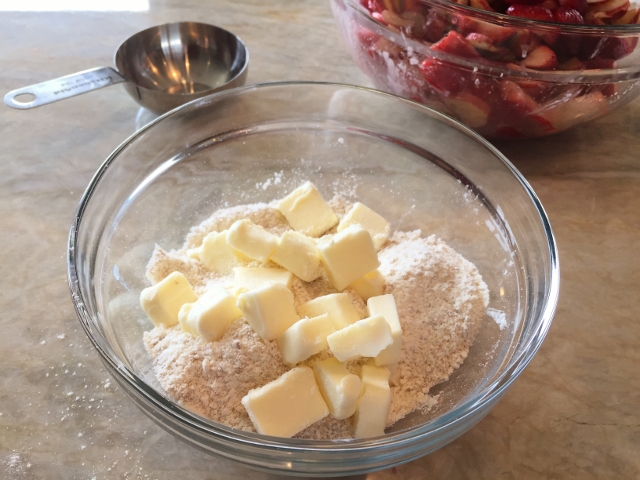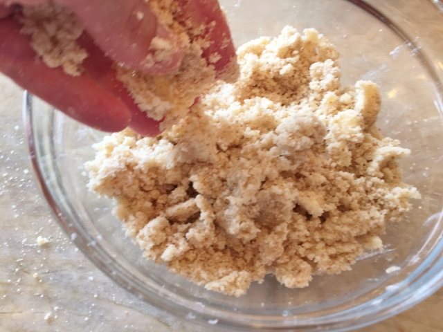 3. To make the topping – add flour, sugars and butter in a small bowl. Using your fingers, squeeze butter into the dry ingredients, until it resembles coarse crumbs. Set aside.
