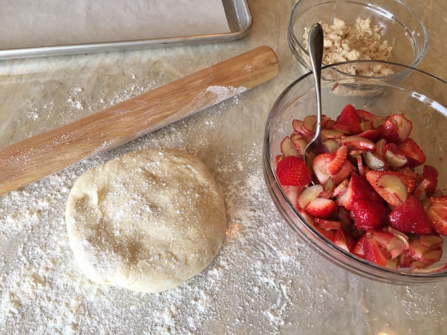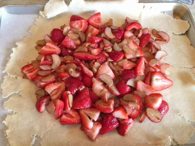 4. Remove dough from refrigerator and place on a flour-dusted surface. Using a rolling pin, roll dough out into an 20-inch circle and place it on a parchment lined sheet pan. Spoon strawberry rhubarb mixture into center of the dough and spread it out until it reaches 2-inches from the edges.