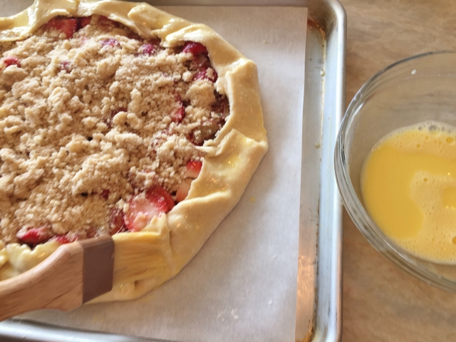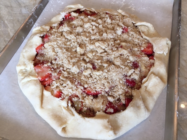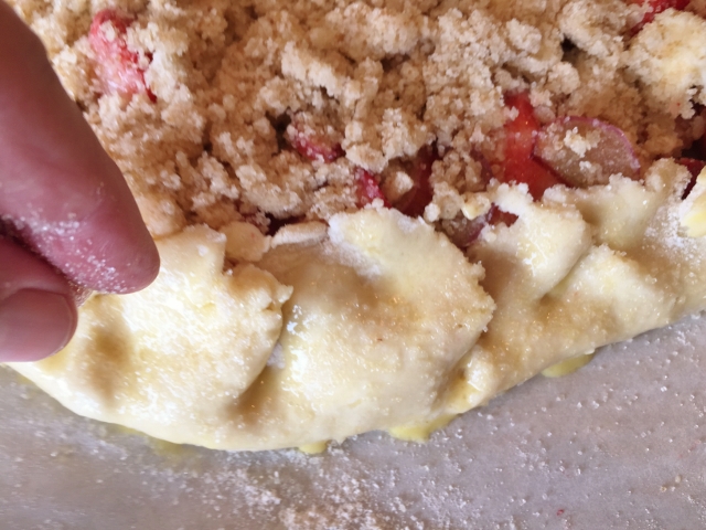 5. Sprinkle crumb topping on top of strawberry rhubarb mixture. Turn dough up onto strawberry rhubarb mixture to form an edge – sort of a rustic pleated edge.