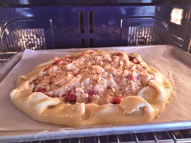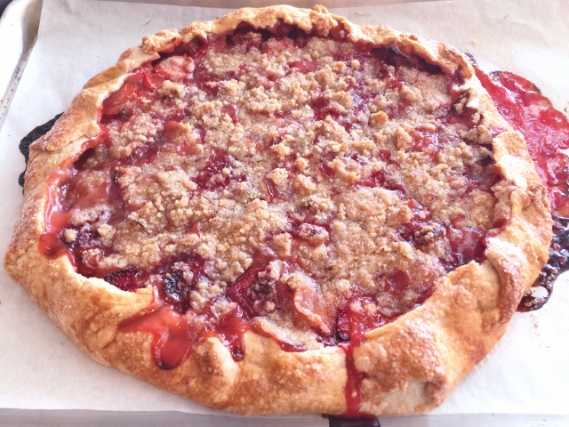 The large circle of dough, filled with a mixture of strawberries and rhubarb cooks evenly when spread out more flat with hand-formed rustic edges. The fruits turn into a thickened syrupy blend that tastes like fresh preserves spooned from a jar.