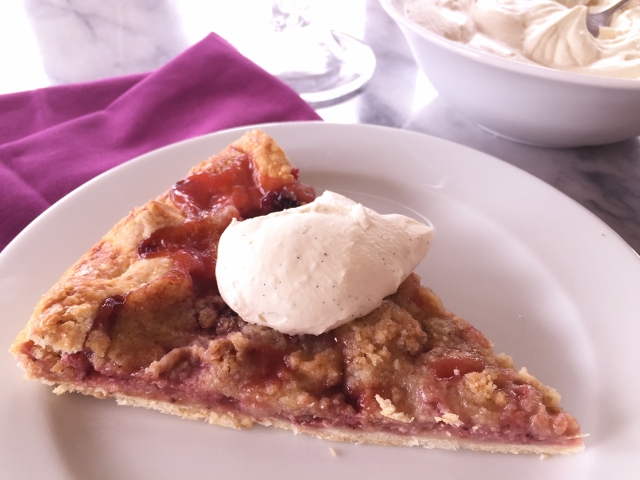 8. To make mascarpone cream – in a stand mixer, add heavy cream and beat until frothy. Then, add the mascarpone, confectioners sugar and vanilla extract, beat until soft peaks. Place in a bowl to serve with Strawberry Rhubarb Crostata. Slice crostata and serve on plates with a dollop of cream. Enjoy!