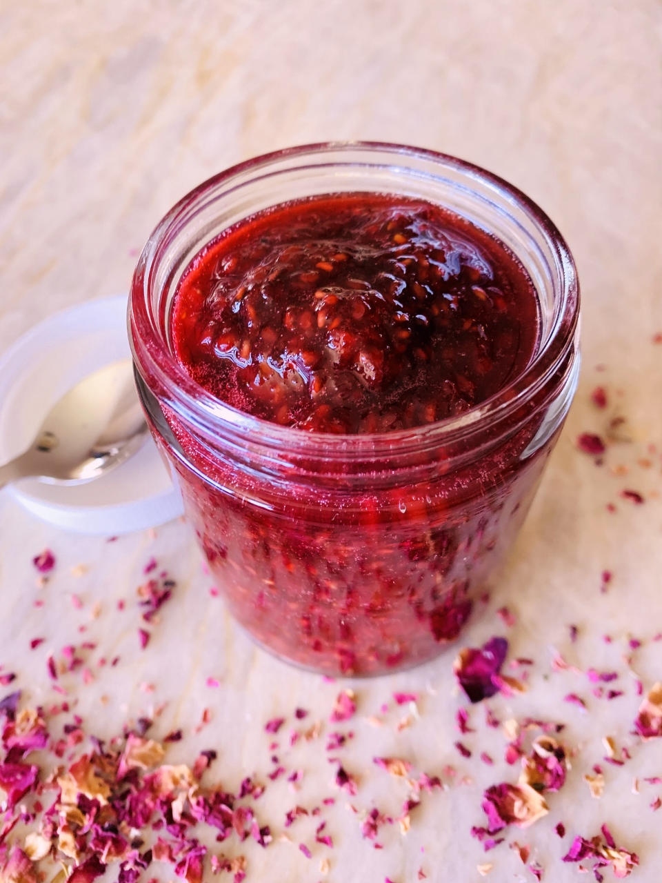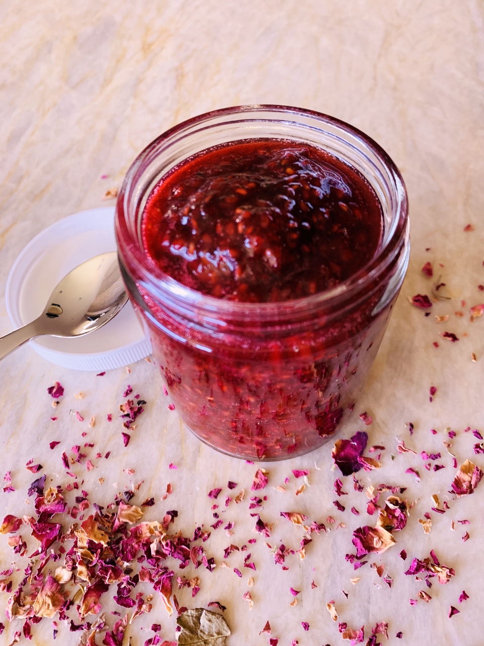 Strawberries have enough natural pectin in them, so you don’t need to add anything to them for thickening. Also, the small amount of raspberries I added helped bring the fruity jam together, along with some sugar for additional sweetness. A touch of rose water goes along way, so I included just a splash, for an incredible fragrance that won’t remind you of bubble bath, I promise.