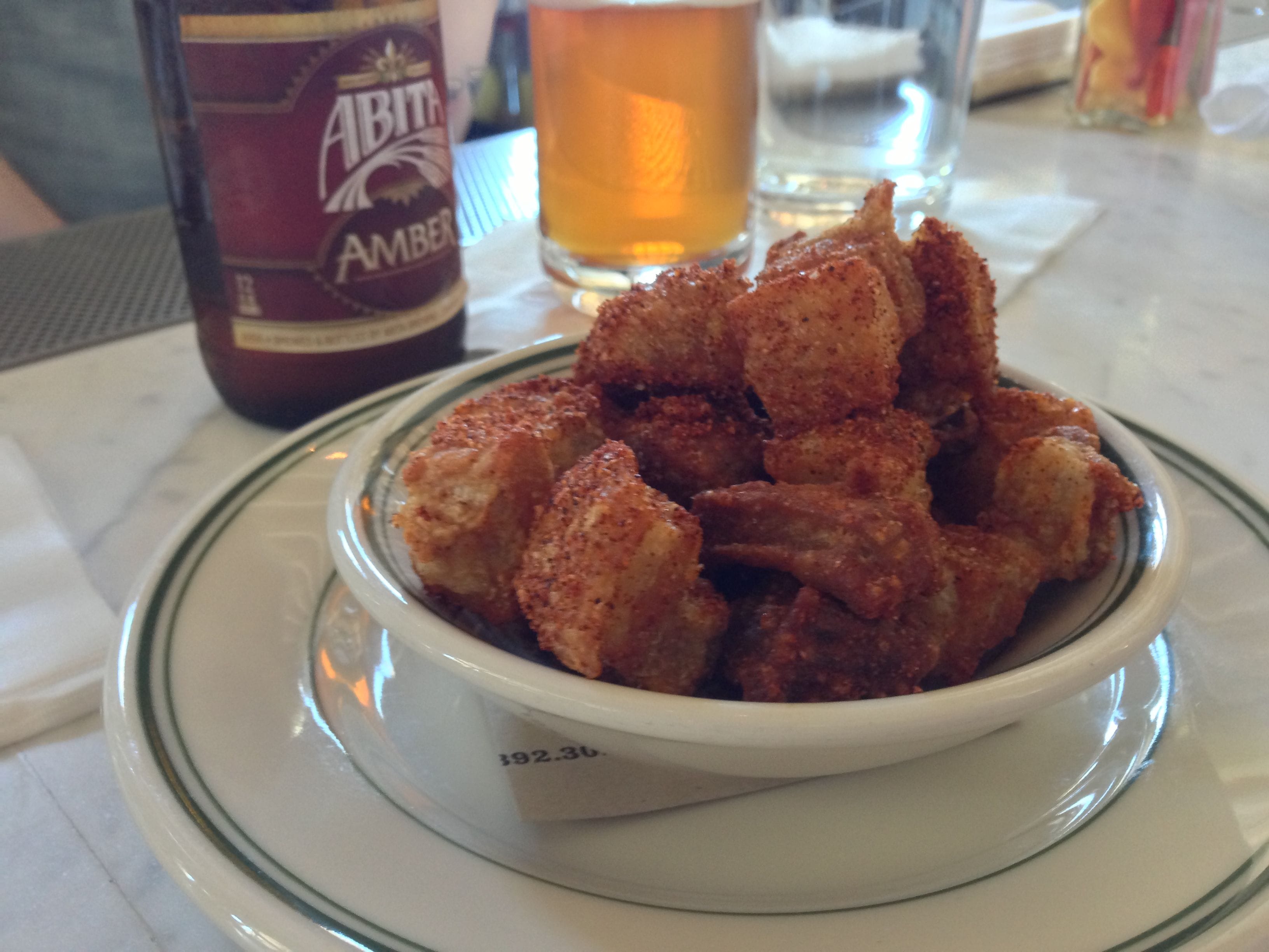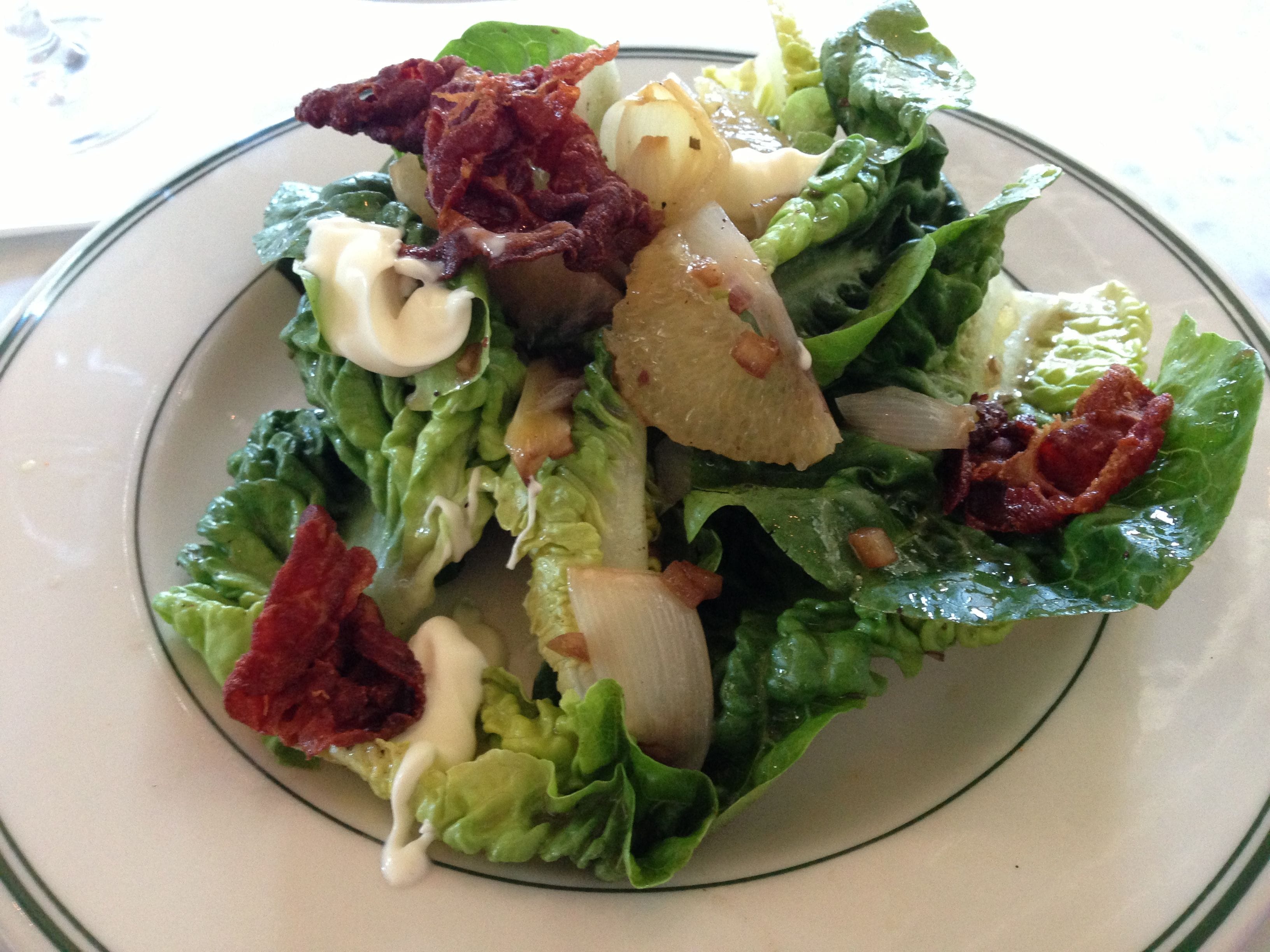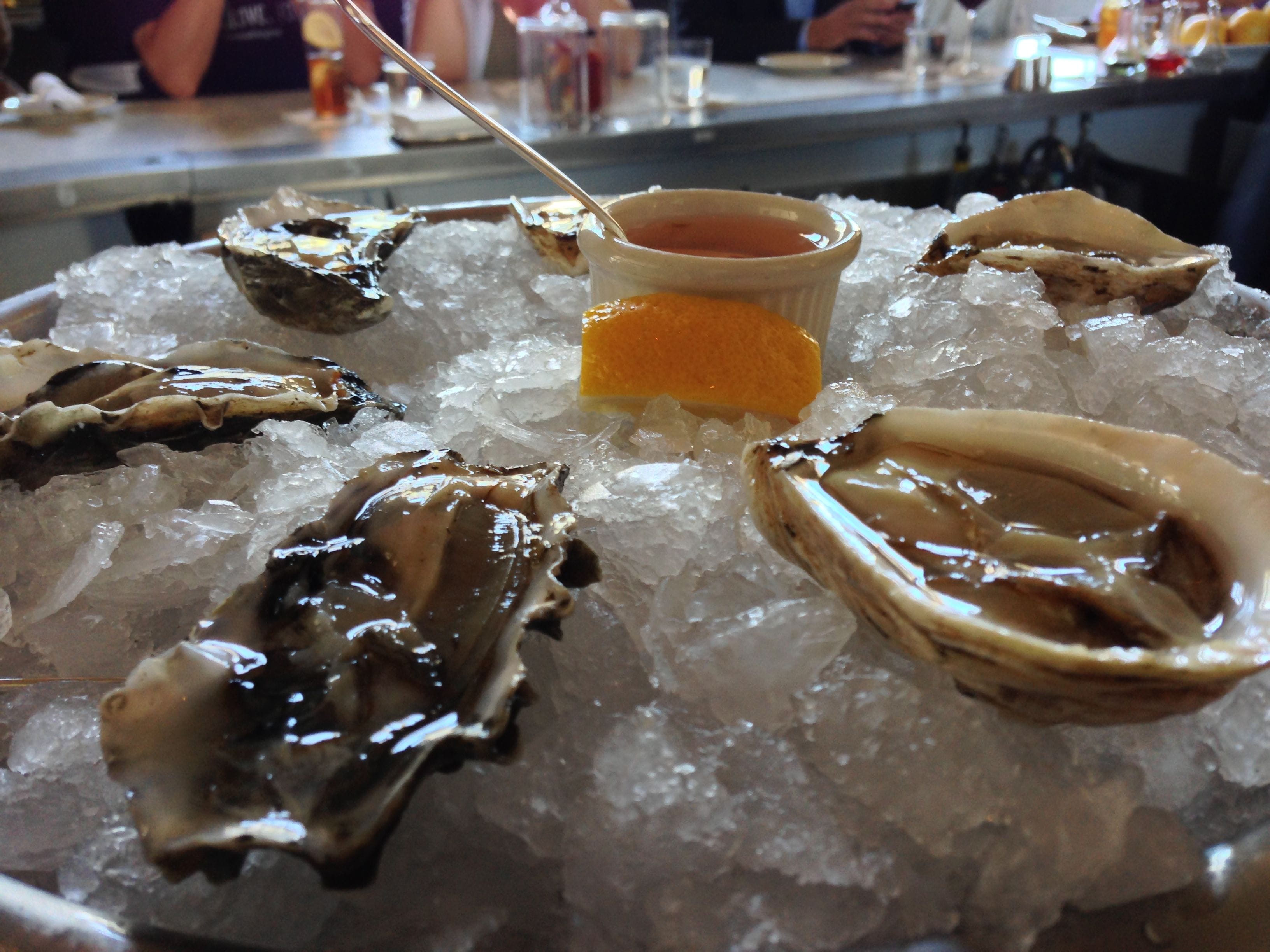 The Pork Cracklins caught my eye because I am a huge pork fan. These beauties were not your average cracklins – pork belly cubed up and fried, then tossed in a dry spice rub. These little porkies were chewy, crunchy and hot all at once, lovely! After the pork I needed something a little lighter so, oysters on the half shell with a butter lettuce, grapefruit and bacon salad were refreshingly nice. Maybe not too light?