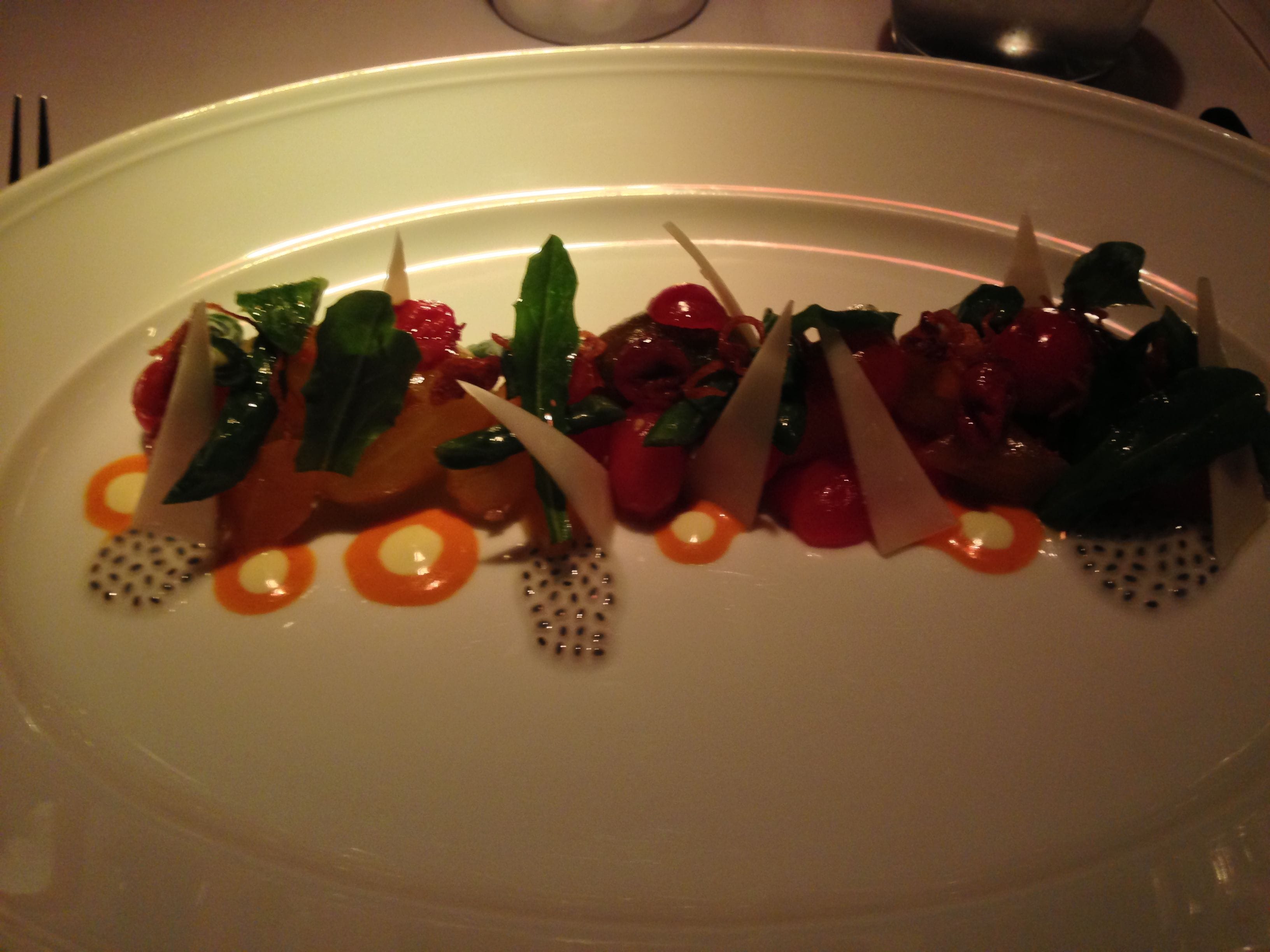 We each had two courses followed by a shared dessert and it was the perfect amount of food considering our trip. I started with the Tomato and Melon Salad with harissa and aged goat cheese. It was beautiful to look at as well as eat. Delicate and delicious were the tomato and melon with just a small hint of spice from the harissa. This salad was so wonderful and the picture doesn’t give it justice. My husband had the chicken wings of all things, that were deboned and served elegantly with nigella seeds, cashews and a yogurt sauce. Not your typical wings.