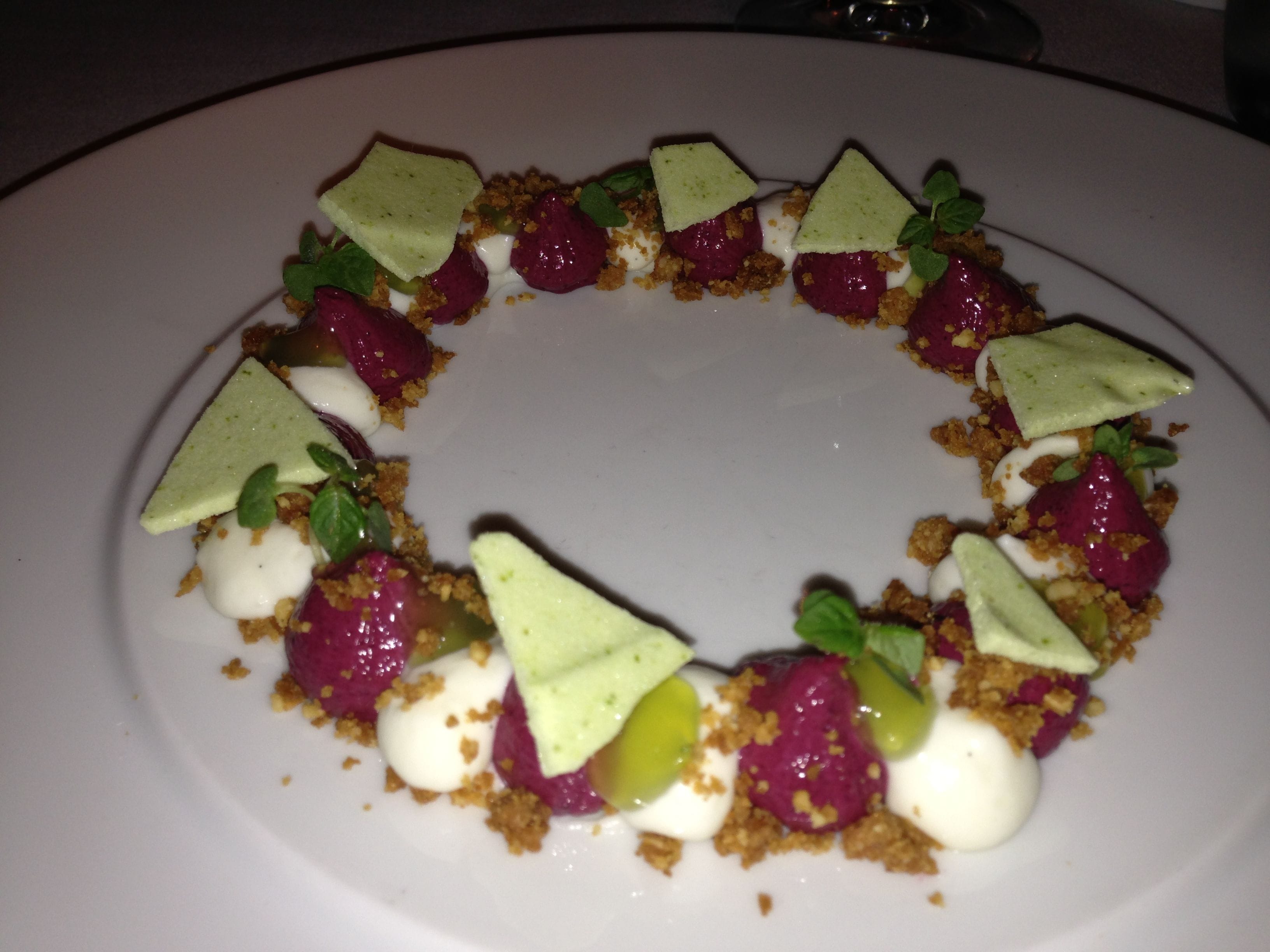 As for dessert, Black Currant Curd with vanilla cream, almond sable cookie and pieces of fennel meringue was presented in a colorful ring and tasted as good as it looked. Aziza is creating some very wonderful food with spectacular flavors and freshness.