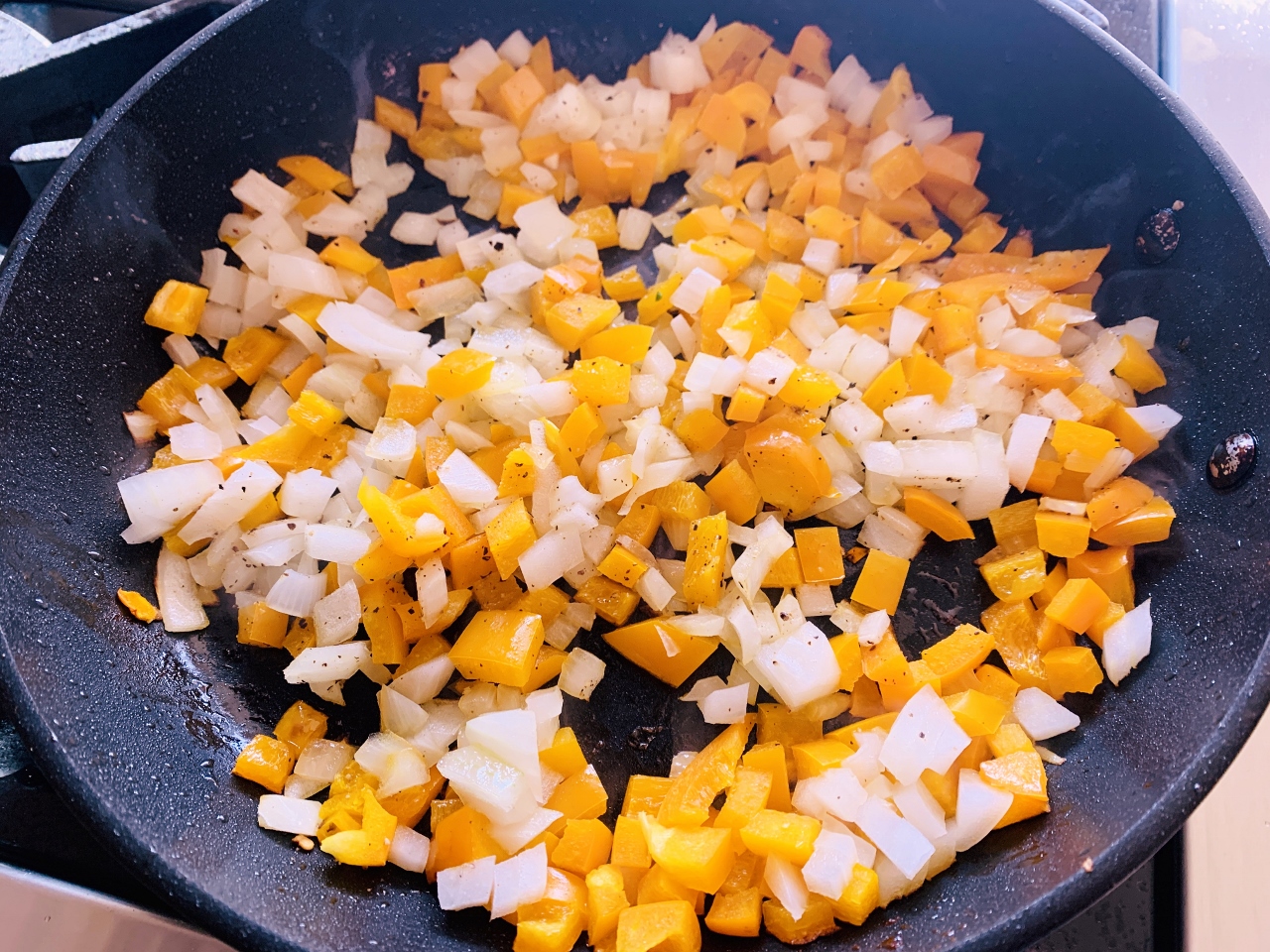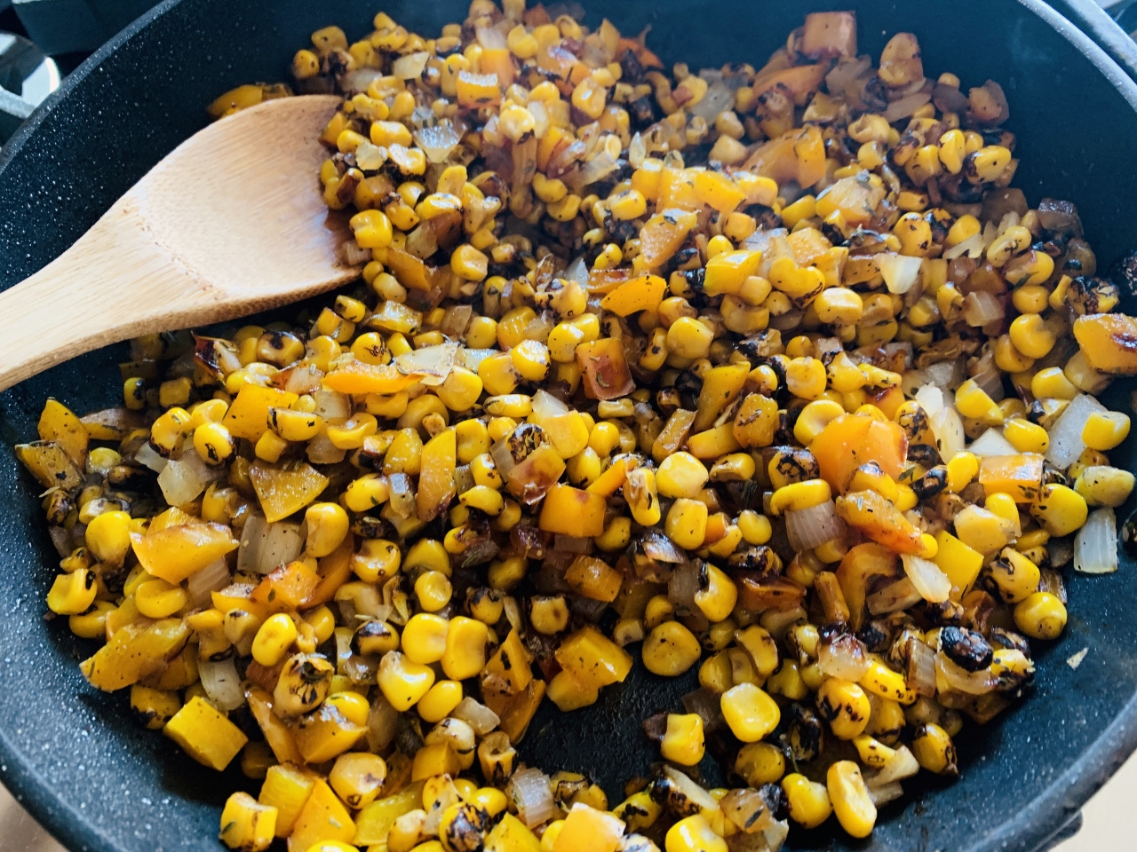 - In a large saute pan add 2 teaspoons olive oil and place over medium heat. Add onion and bell pepper and saute for 3 minutes. Add corn and beans, stir to combine. Add thyme, 1 teaspoon salt and 1/2 teaspoon black pepper. Continue to cook for 4 minutes.