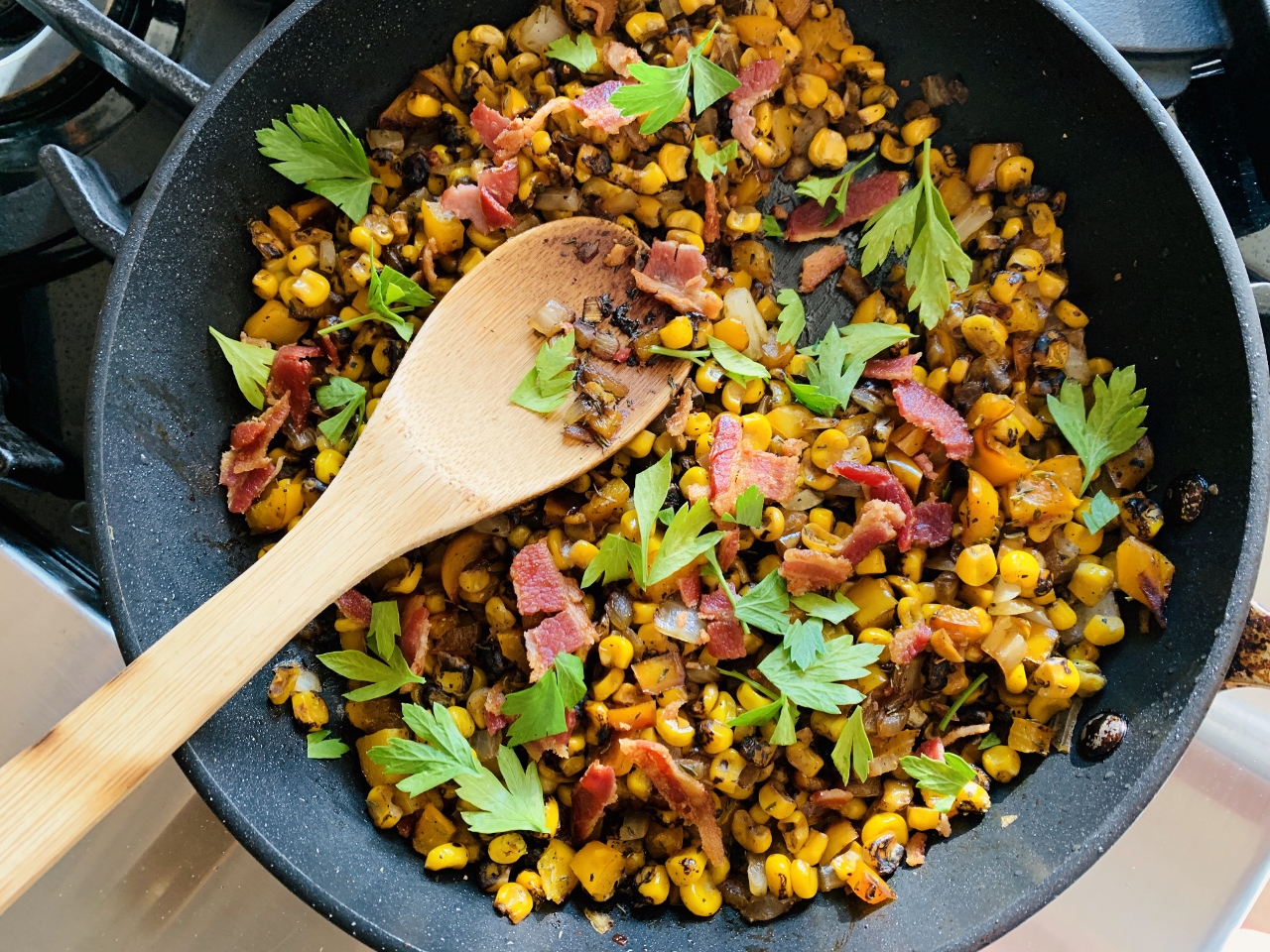 Side dishes, like corn, are a necessity with grilled meat, chicken or fish and succotash makes a great accompaniment to complete any meal and satisfies even the finickiest of vegetables eaters. I added crispy bacon to this recipe because the flavors of corn and bacon are something my family enjoys, but you can leave it out if you’re a vegetarian. If fresh corn is a challenge to find quite yet, frozen corn is a great replacement because it’s flash frozen straight from harvest, and just as sweet.