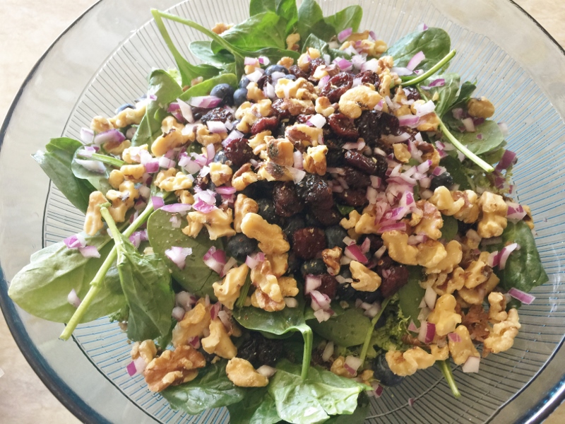 2. Add spinach leaves, red onion, blueberries, cranberries and walnuts, toss.