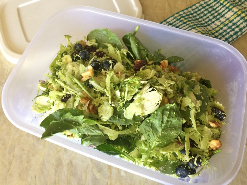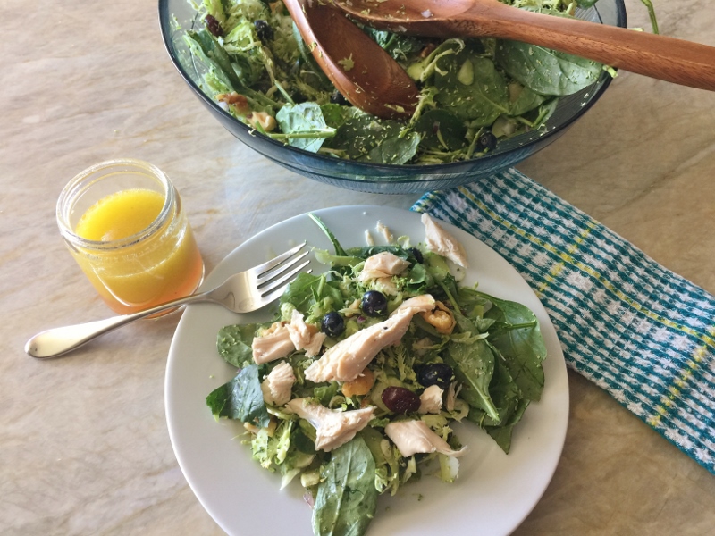 So, here’s my version of a superb Superfood Salad – one quick hint…use your food processor to slice the brussels sprouts and broccoli, and then toss with leafy spinach. Also, the vinaigrette is a snap and perks up the mix of greens with a sweet and tangy balance. You can always add some shredded chicken or tuna to the mix for a bump of protein – it’s going to be a nice thing to eat during the hot week ahead.