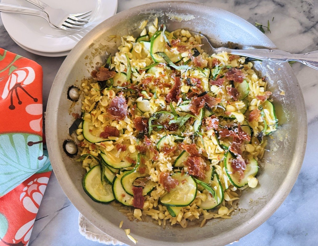 Sweet Corn and Zucchini Orzo with Crispy Prosciutto is an easy summer recipe featuring tender orzo, sweet corn, and zucchini for a light, flavorful meal.