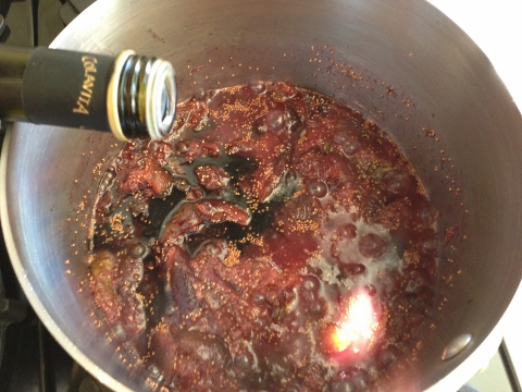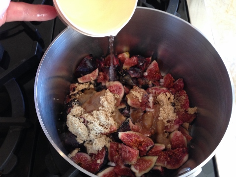 3. Turn the heat on medium-high and cook the fig mixture for 25 minutes or until the liquid is mostly absorbed and the figs break down. Then, add the balsamic vinegar to the pan and cook for 5 more minutes.