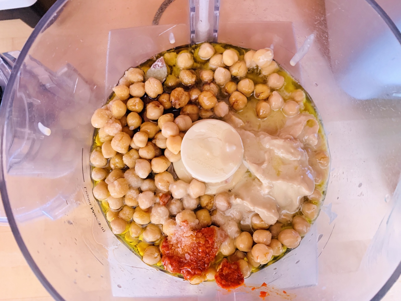1. In a food processor, add all ingredients except sesame seeds and Aleppo.  Puree until mostly smooth.