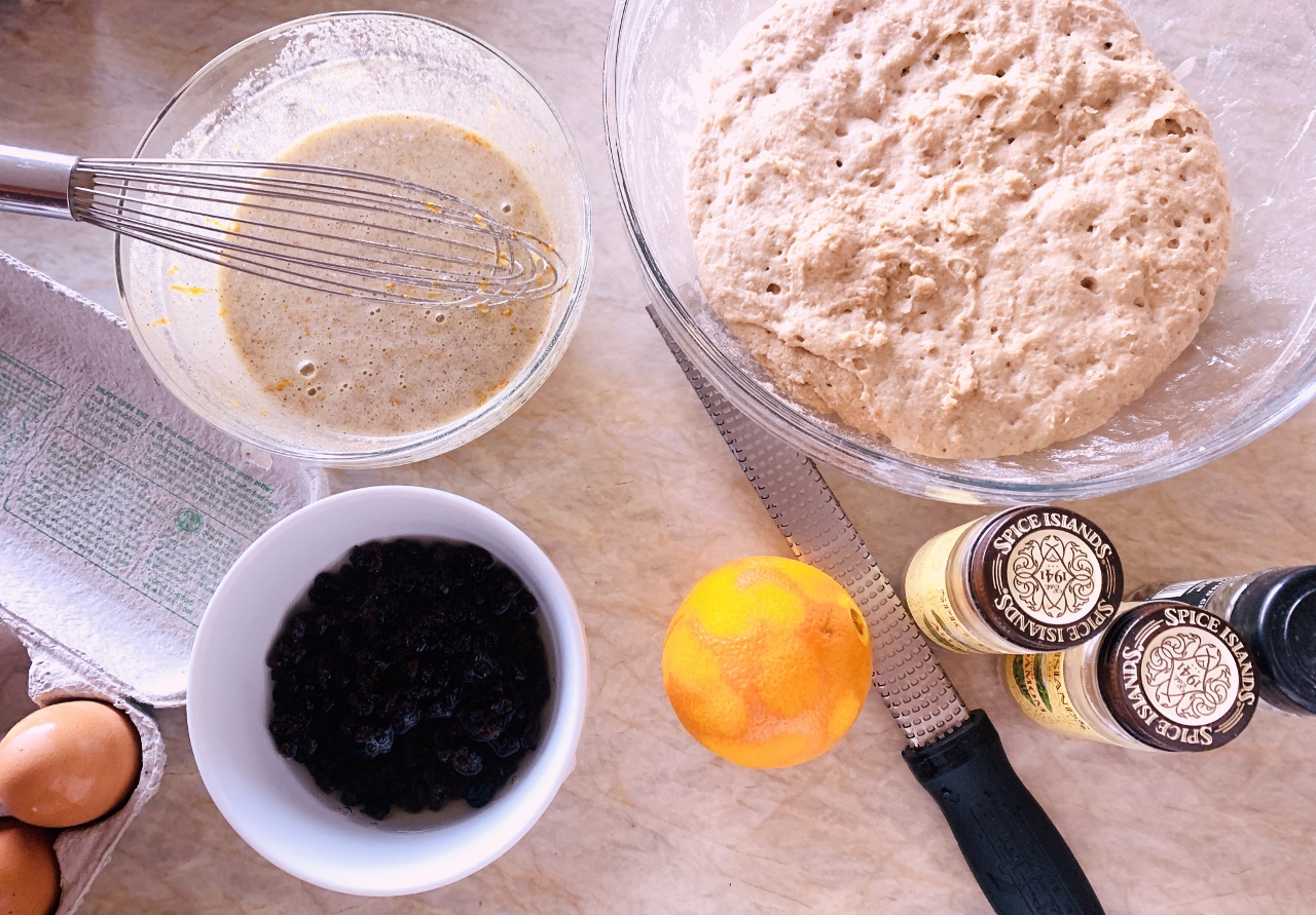 2. In another bowl, whisk together sugar and eggs until combined.  Add salt, allspice, cardamom, cloves and orange zest.  Make a well in center of Preferment dough, then add egg mixture.  Using your hands, fold wet mixture into dough, until combined.  Still a bit shaggy looking, but that’s okay.