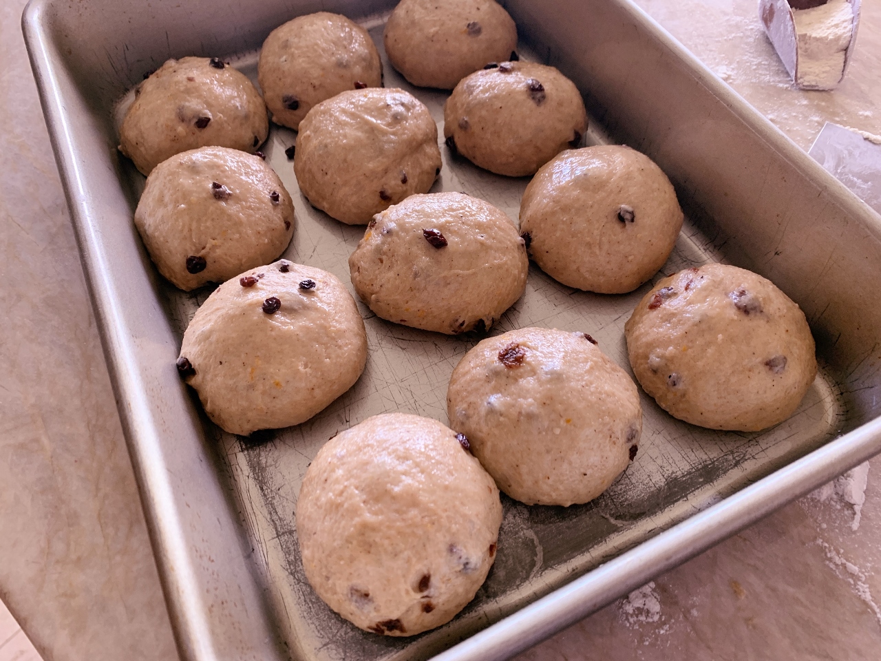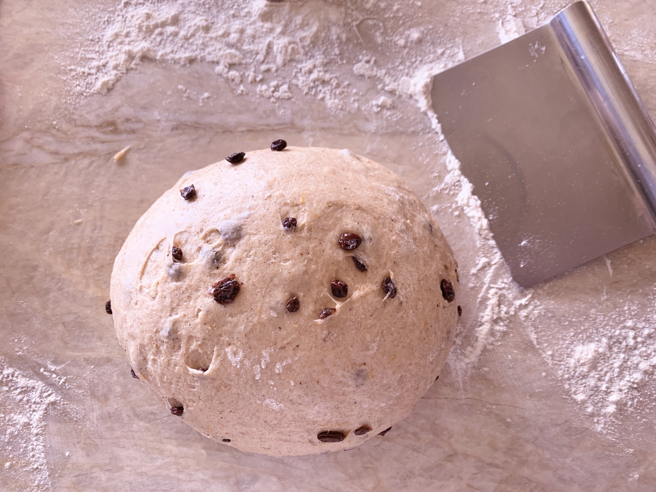 3. Add bread flour and mix until dough becomes smooth and elastic, about 5 minutes.  Sprinkle with currants and knead until smooth.  Cover bowl with plastic wrap and let rest for 1 1/2 hours.