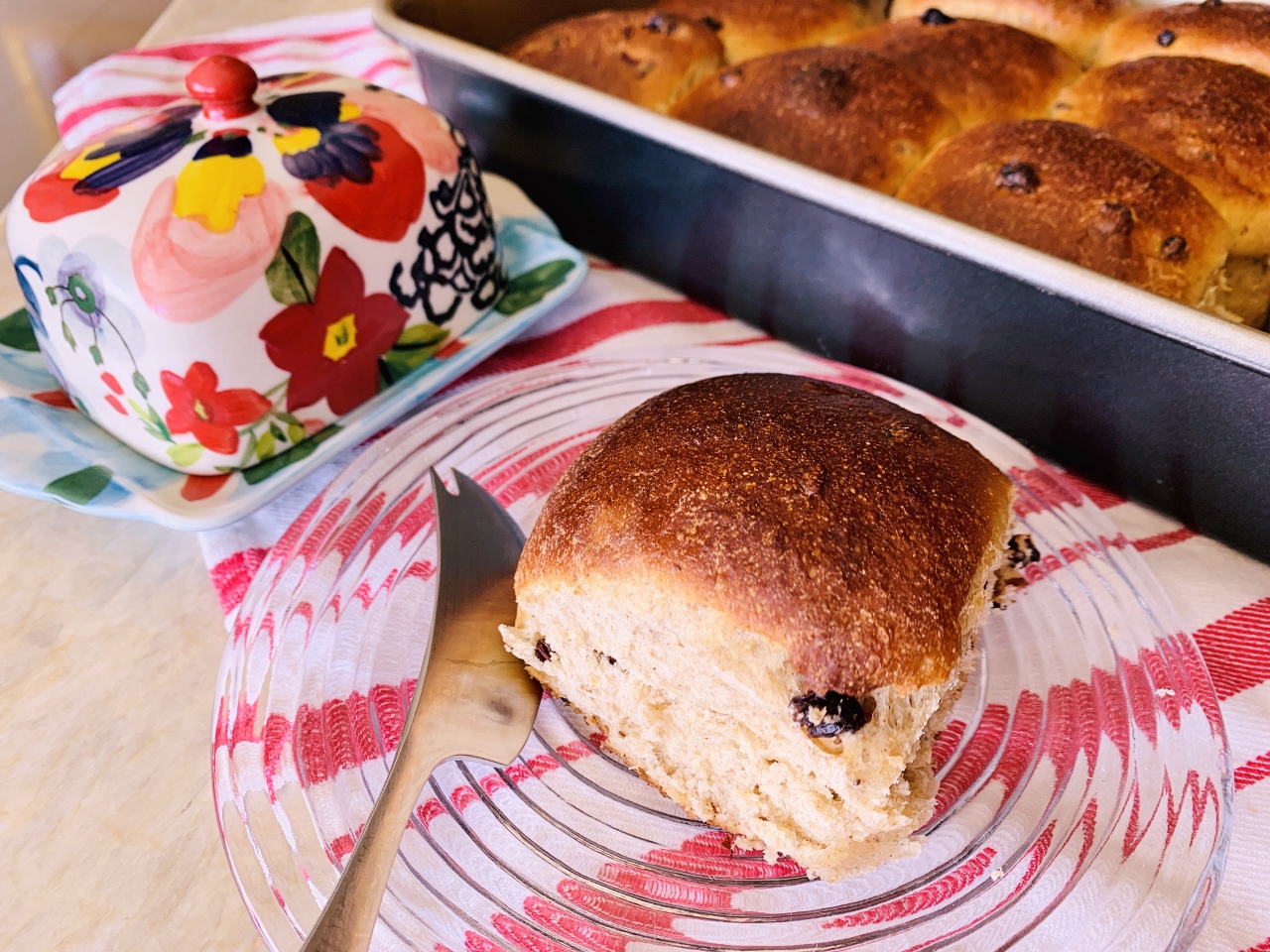 3. Add bread flour and mix until dough becomes smooth and elastic, about 5 minutes.  Sprinkle with currants and knead until smooth.  Cover bowl with plastic wrap and let rest for 1 1/2 hours.