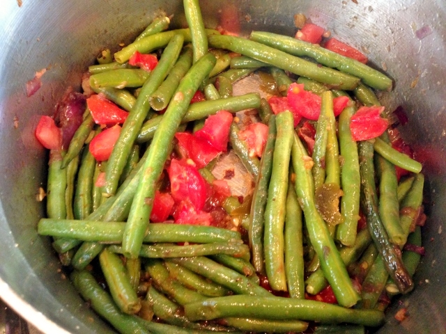 2. Add green beans and another tablespoon of olive oil to pot and saute for an additional 8 minutes.  You do want a little browning, but if the heat is too high, vegetables will start sticking.