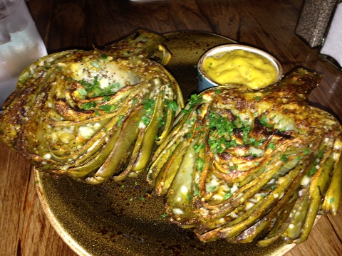The menu is loaded with Farm-To-Table recipes and if we hadn’t indulged on the guacamole and seven-layer dip at the Inns happy hour/super bowl party, we might of eaten more. We started with the Wood-Oven Roasted Artichoke with Mediterranean Mayo. The artichoke with cooked perfectly with a hint of smoke and a sprinkling of parmesan cheese. The mayo was nice, but unnecessary – the artichoke held its own.