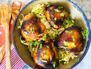 Food Main Courses Seared Korean Barbecue Thighs with Pickled Slaw – Recipe! August 15, 2023 / November 23, 2025 by Gena Bell | Leave a Comment Good chicken recipes can be as easy as 1-2-3 and this recipe for Seared Korean Barbecue Thighs with Pickled Slaw has only three steps to create a fantastic meal. Step 1 – marinate the chicken thighs in a flavorful combination of gochujang or Korean barbecue paste, along with pickle juice and water. The chili paste […] Read more » Chicken Recipes cooking with Gena Bell genabellrecipes How to Use Leftover Pickle Juice Korean Chicken Thighs Recipe Seared Korean Chicken Thighs and Pickled Slaw - Recipe!