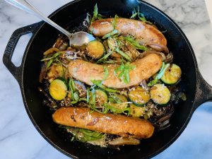 Food Family Style Laugh Main Courses Skillet Chicken Sausages, Onions, Zucchini & Basil – Recipe! July 7, 2021 / November 23, 2025 by Gena Bell | Leave a Comment If you’re anything like me, you love a good dish of sausage and peppers. One of my best friend’s dad’s used to make an outstanding Sicilian-style version that was roasted in the oven with baby potatoes, but I thought it being summer and all, that a lightened up stove top version was in store. Using […] Read more » cooking with Gena Bell genabellrecipes Onions Sausage Recipes Skillet Chicken Sausages Skillet Meals Skillet Sausages Stove Top Meals Summertime Dinners Weeknight Meals Zucchini & Basil - Recipe!