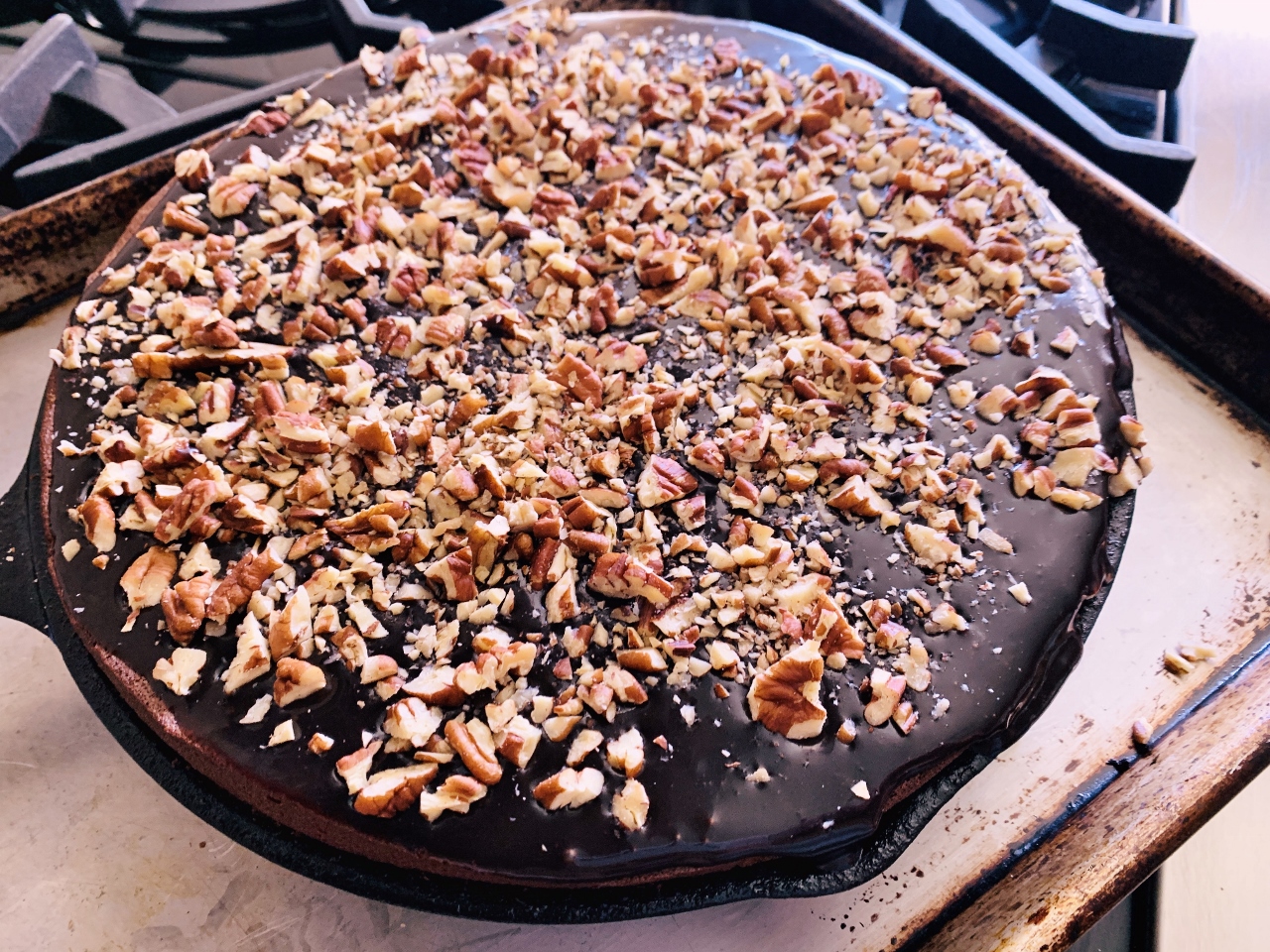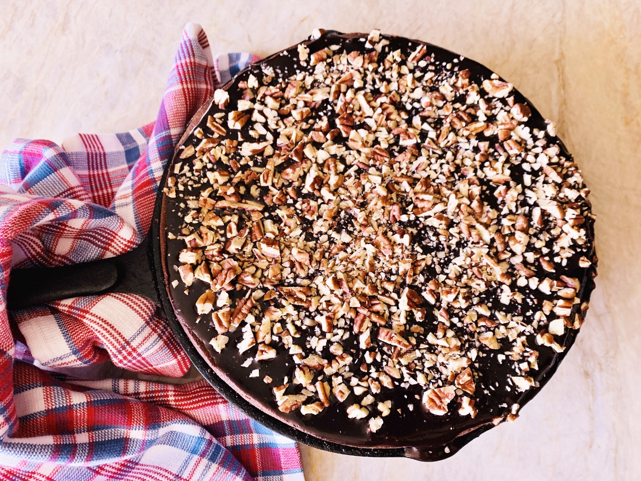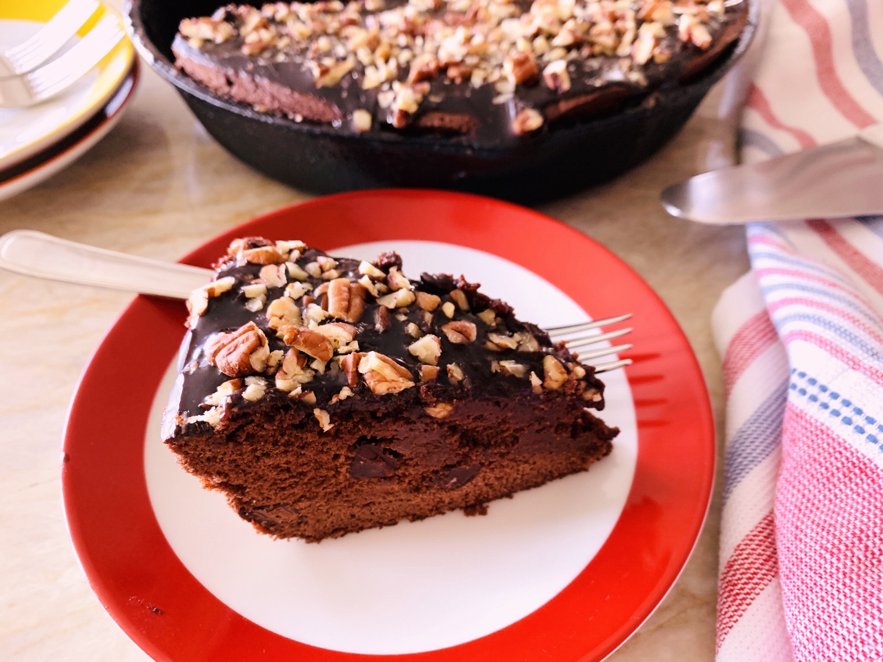 A classic Texas Sheet Cake is a chocolate cake smothered in chocolate pecan frosting, and if you hadn’t guessed, it’s big and bold, like you would think things are in Texas. Most sheet cakes are baked in sheet pans of course, however using an iron-skillet seems much more rustic and gratifying. This soft crumbed cake is slathered in fudgy frosting, that you quickly mix up in a saucepan, and top with toasted pecans. For a homemade cake, it’s the easiest thing you can bake, that tastes this chocolaty good. I made a short video to show how simple it is to make, and to get those mouths a waterin’, so you will bake one at home.