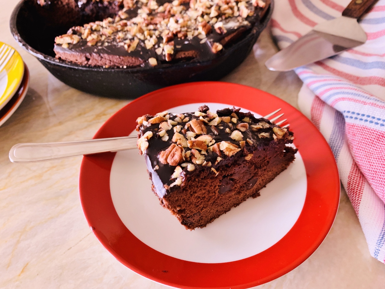 A classic Texas Sheet Cake is a chocolate cake smothered in chocolate pecan frosting, and if you hadn’t guessed, it’s big and bold, like you would think things are in Texas. Most sheet cakes are baked in sheet pans of course, however using an iron-skillet seems much more rustic and gratifying. This soft crumbed cake is slathered in fudgy frosting, that you quickly mix up in a saucepan, and top with toasted pecans. For a homemade cake, it’s the easiest thing you can bake, that tastes this chocolaty good. I made a short video to show how simple it is to make, and to get those mouths a waterin’, so you will bake one at home.