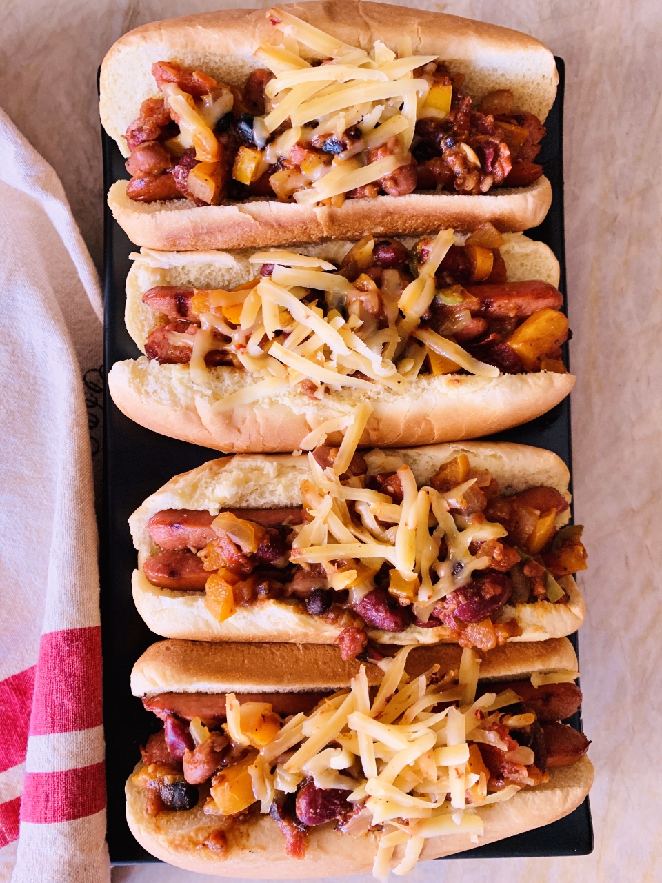 Grilling hot dogs either in a grill pan, or outside is the way to go during the summer. I like to cut them almost in half and sear both sides for a blistered casing with grill marks. As for the chili, bean chili is an easy prep using pantry ingredients and I must say, it tastes amazing. Canned beans with the right seasonings and some diced tomatoes, cook up into a thick and chunky topping for these dogs. It’s so good, you can double the batch and enjoy it later all by itself, or go for another round of chili dogs.