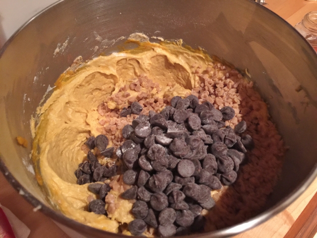 3. Add yogurt and mix on low for 1 minute. Add toffee and chocolate chips and mix for 30 seconds. Remove bowl from stand and mix-by-hand to make sure all ingredients are combined.